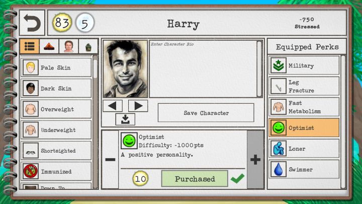 再开始游游戏前,玩家可以选择不同角色(猎人、农夫、游客、人鱼),每个角色都有其独特背景故事以及特质(不同难度),初始的猎人对新手极其友好,基本上都是正面buff(简直就是超人)。此外,我们还能自定义角色,玩家可以上传图片,自己挑选特质,相当于自定义生存难度。