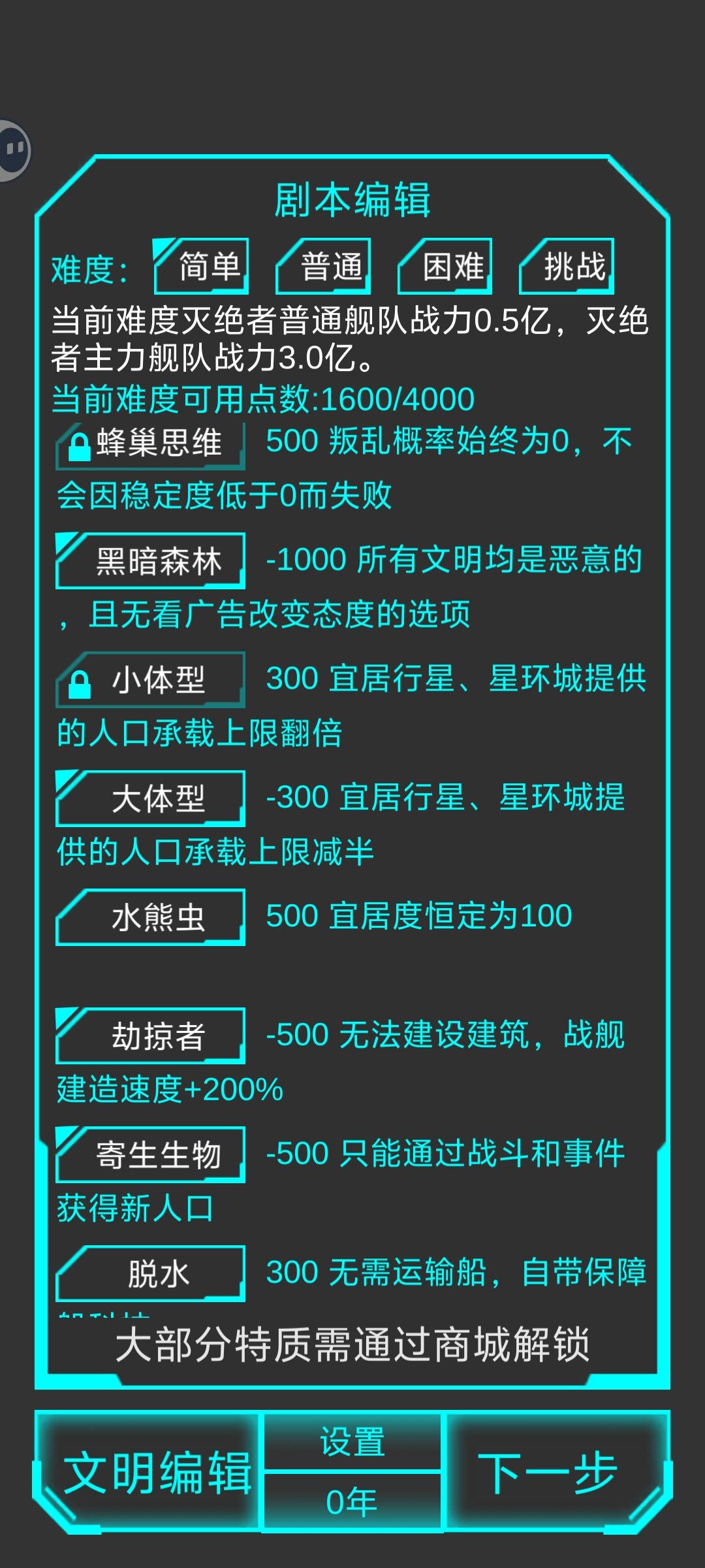 开局选择星球密度稀疏,宜居行星少。人口1M,科技2级初始状态移动,战舰数量10,文明态度凶恶灭绝者移速10%光速,最重要,能争取约800年发育时间,选这个才能保证在初始星球一路苟到无敌稳定度-1,遗迹概率5%(遗迹虽然重要但总体需要不大,5%保证遗物背包能装满就行了)特性1.黑暗森林-1000,所有文明均恶意且无法看广告改变态度2.大体型-300,人口承载上限减半3.寄生生物-5