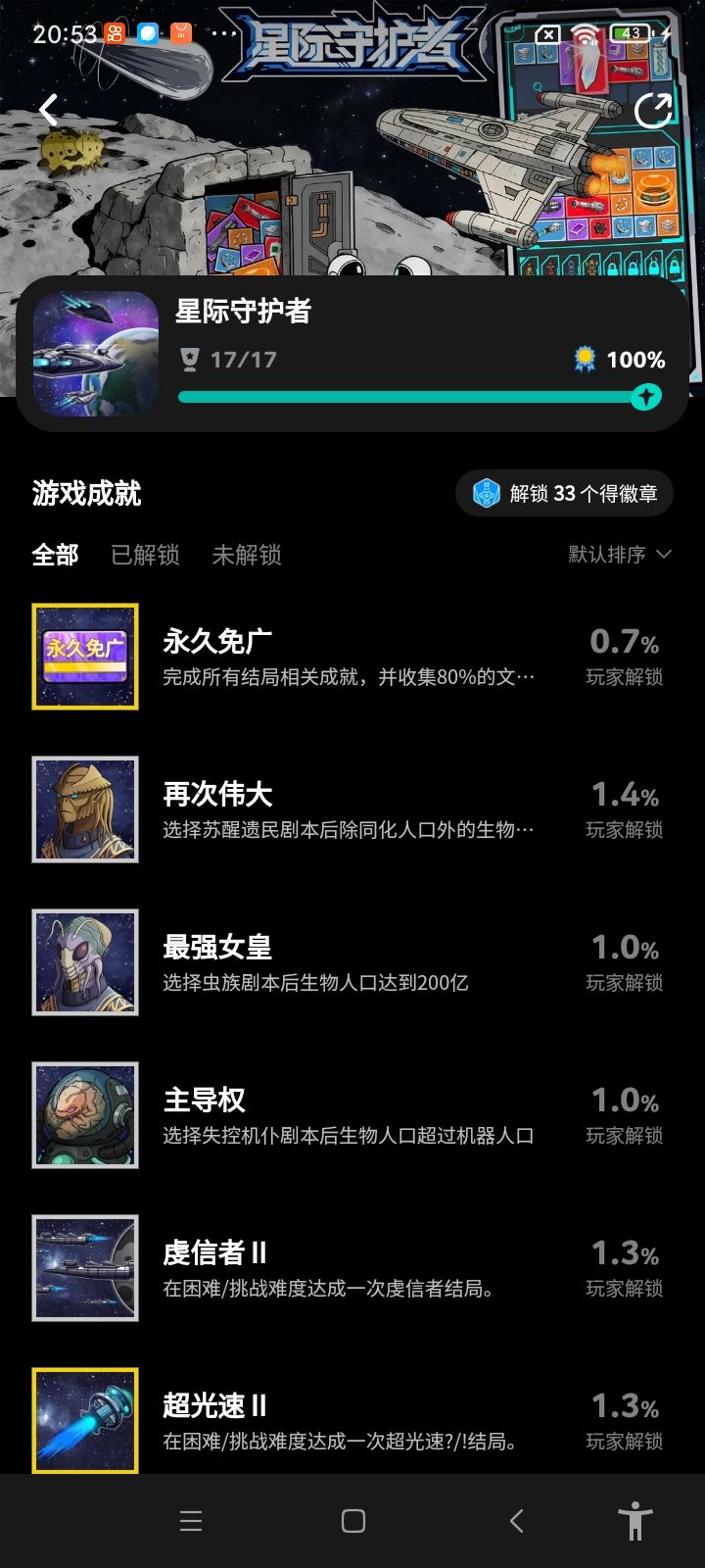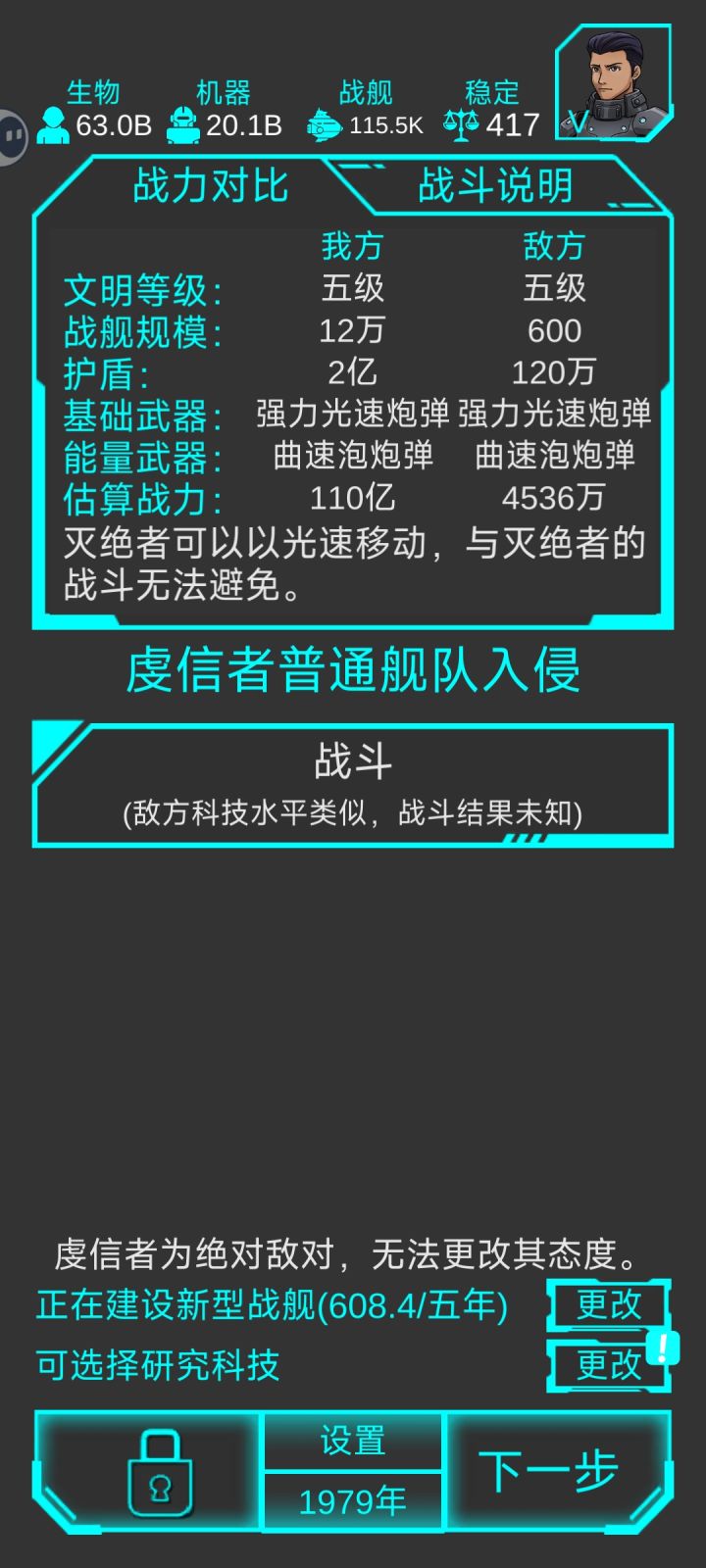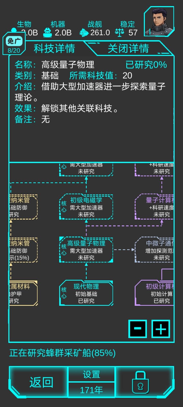基本不需要看广告的流派(极低概率前期打架打输了,看一次),时间很充裕,战力碾压注意事项:稳定不到100时,每五年选项:选稳定度+1;遗迹只进前三次的三级遗迹(不进也行);打法思路:开局母星研究科技研究到没东西研究(主研究研究速度和机械人口的科技,不要急着研究核心科技),然后找个黑洞定居,研究满了以后造船,灭绝者到来之前已经无敌。剧本编辑#星际守护者 0基本属性:三级科技,灭绝者移速1