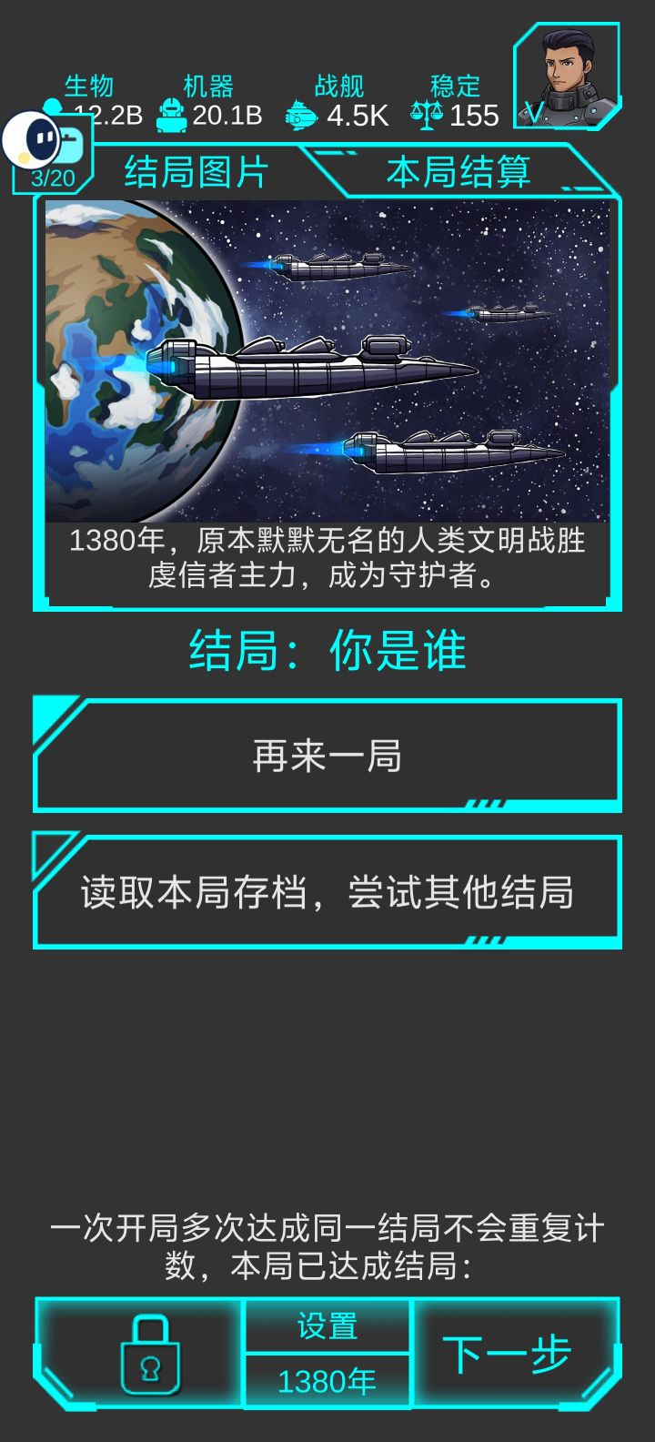 基本不需要看广告的流派(极低概率前期打架打输了,看一次),时间很充裕,战力碾压注意事项:稳定不到100时,每五年选项:选稳定度+1;遗迹只进前三次的三级遗迹(不进也行);打法思路:开局母星研究科技研究到没东西研究(主研究研究速度和机械人口的科技,不要急着研究核心科技),然后找个黑洞定居,研究满了以后造船,灭绝者到来之前已经无敌。剧本编辑#星际守护者 0基本属性:三级科技,灭绝者移速1