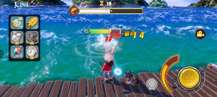 钓鱼的表现力较好,关键区域展示清晰易理解,攻击飘字基本是连续的,有连击的爽感。爆气类似开大招的概念,画面会以中心开始抖动,视觉冲击力很好,比较吸引眼球。