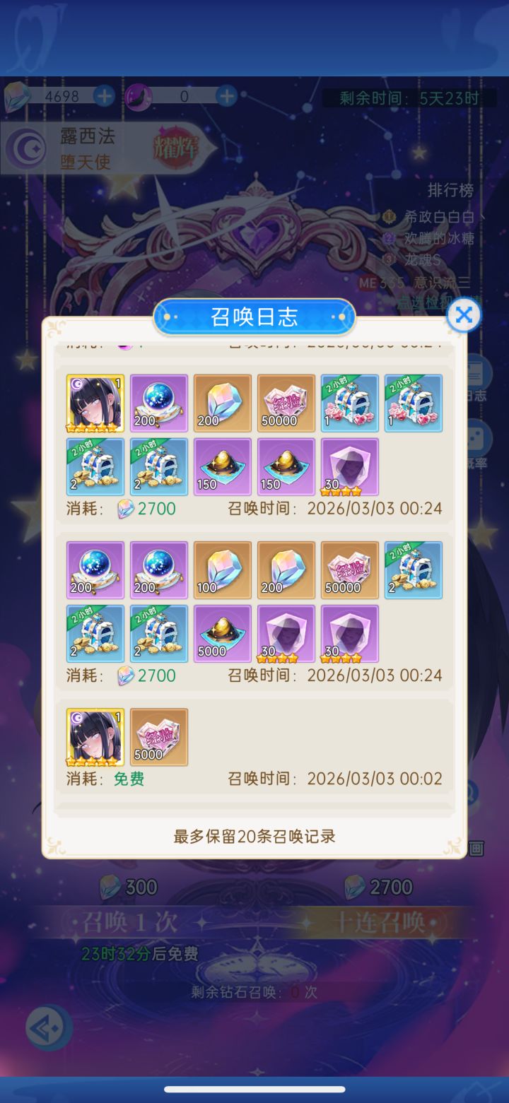 签到送一个路西法,每日免费单抽出一个,想了想每天20发还够我120发保底,结果20抽又出一个