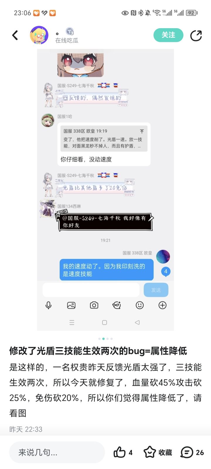 是这样的,一名权贵昨天反馈光盾太强了,三技能生效两次,所以今天就修复了,血量砍45%攻击砍25%,免伤砍20%,所以你们觉得属性降低了,请看图
