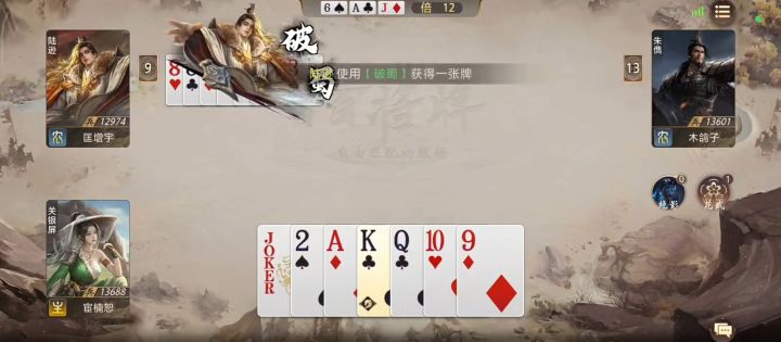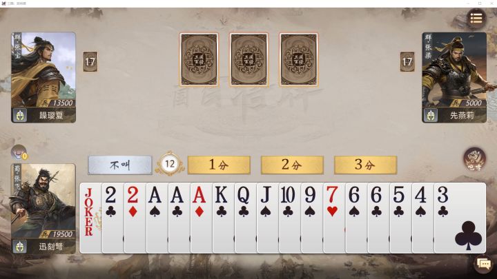 加了武将系统的斗地主,突出武将技能系统,可以获得超出扑克牌固定张数的手牌,形成扭转牌局的效果。出牌策略性与斗地主基本一致,上来可以抢地主,并且有积分和奖杯(将星)系统,初级场谨慎一些不难获胜。可能会有机器人填充,到某个段位才匹配真人。