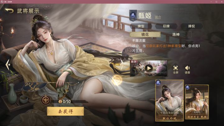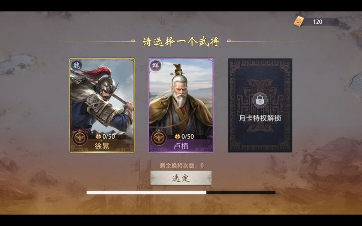 武将总计54名,获取方式很多,包括将星提升、签到、管制提升、商城购买等,在游戏开始前可以二选一,如果有月卡可以三选一。每位武将可以在详情信息界面查看技能效果,也有演示动画,理解技能规则不难。