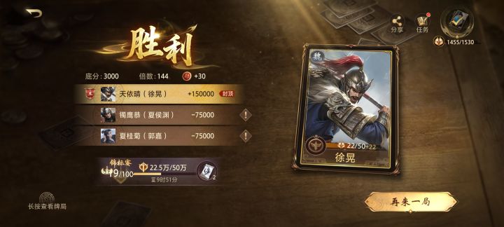 当时感觉会输,博弈一手居然赢了很惊喜,虽然不知道对面是什么牌,因为陆逊每次打牌都会摸牌,所以可能会打乱他的布局,就记一下对面手上可能有啥牌,感觉没对了直接出手,抓到了可以获胜的机会,队友高兴的给我送花。