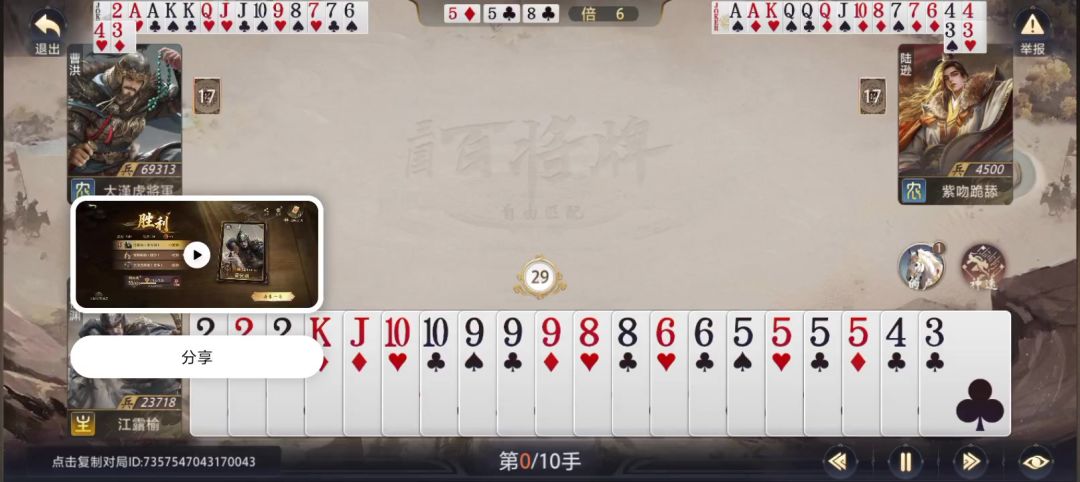 当时感觉会输,博弈一手居然赢了很惊喜,虽然不知道对面是什么牌,因为陆逊每次打牌都会摸牌,所以可能会打乱他的布局,就记一下对面手上可能有啥牌,感觉没对了直接出手,抓到了可以获胜的机会,队友高兴的给我送花。