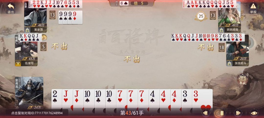 @三国百将牌最后一手,明地主剩五张,暗地主出了六张后,明地主直接6张管上,66666