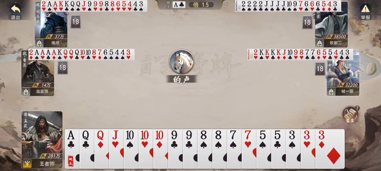 看看我的朋家秀智商是如何低下的: 1.我董卓不出牌时,他不知道走大的,顺过8,智“智商高超”其一…… 2.我出5,他不知道拆地主的牌型,还顶我一手,“智商高超”其二 3.地主是糜夫人,明显是三带一,他硬要打 三带一,“智商高超”其三 4.你特么就算要拼死要打带三带一,是不是也得打三个2去带?!你手上全是大牌,这下留着存银行,以后下去了可以用纸牌当钱花 可怜的孩子,斗啥地主啊,回家喝母乳吧!如此简单