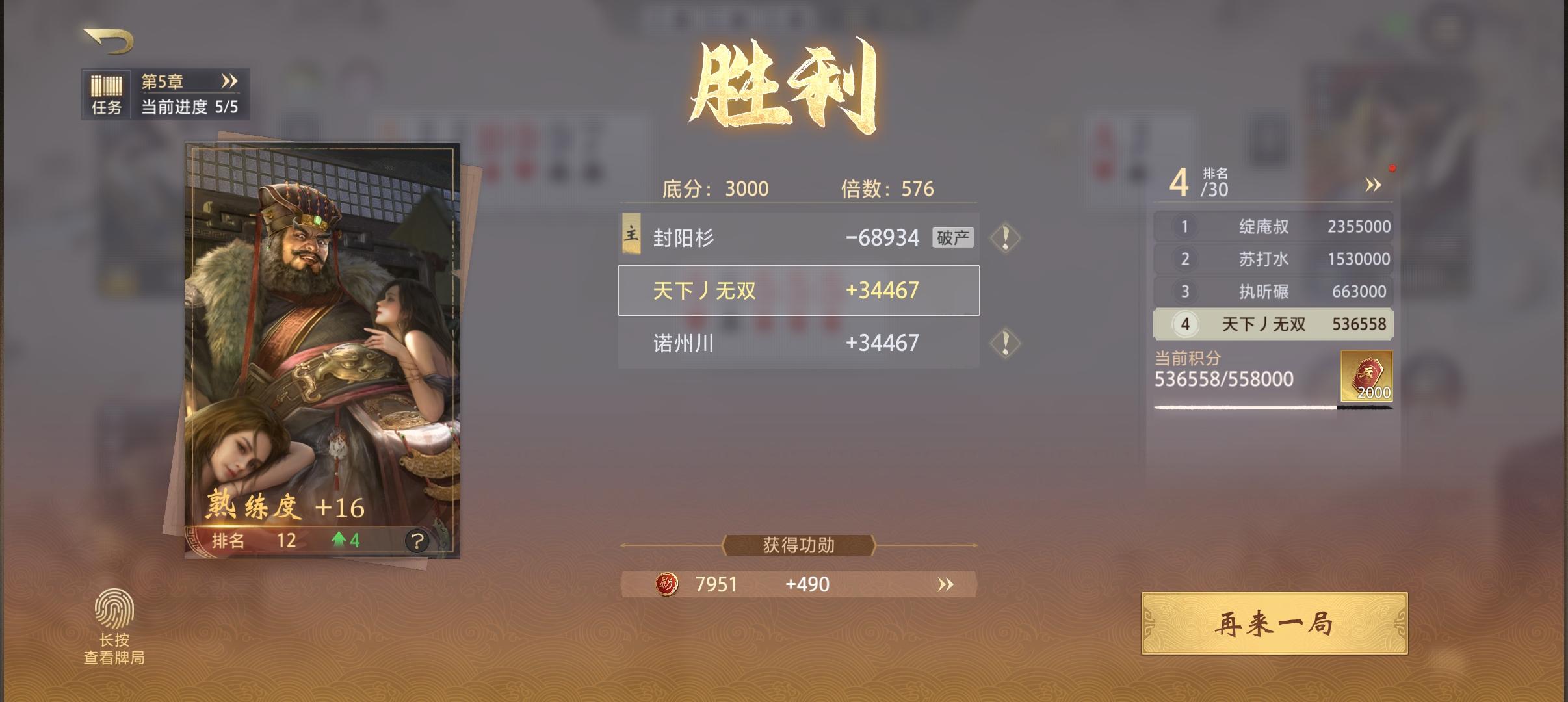 我地主 孙尚香双炸 姜维1炸 最后孙尚香给姜维送单牌 不知道是贪了还是托管了 姜维变3炸 我囤了个炸压上去 96倍 然后5k炸