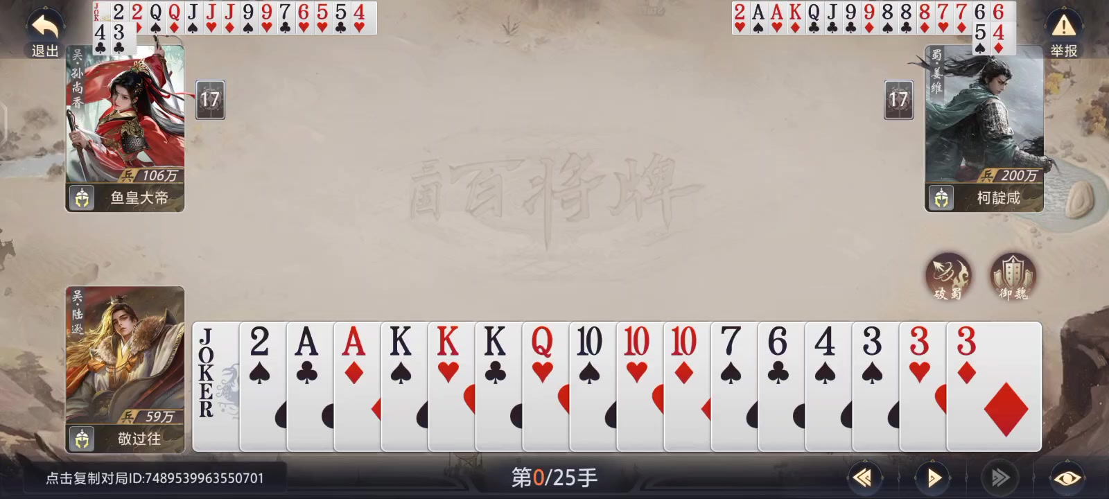 这游戏有时候真的不适合睿智玩 这局姜维牌真的算是天秀开局了,但我的牌虽然没地主好,但给的牌是真的好,给的每一张都是天选,本来是绝杀地主的,但碰到了这个睿智队友,真的是怎么打都白费 地主打出三带一后就剩5张牌,孙尚香3j竟然不管,我看地主出牌跟她开局就2A猜到她3J,我本来寻思地主5张牌她肯定会管,其实不管也无所谓 但后来管我对Q我是真不理解!她一手牌没出,地主一张牌,她拿对2压我对Q是什么脑回路,