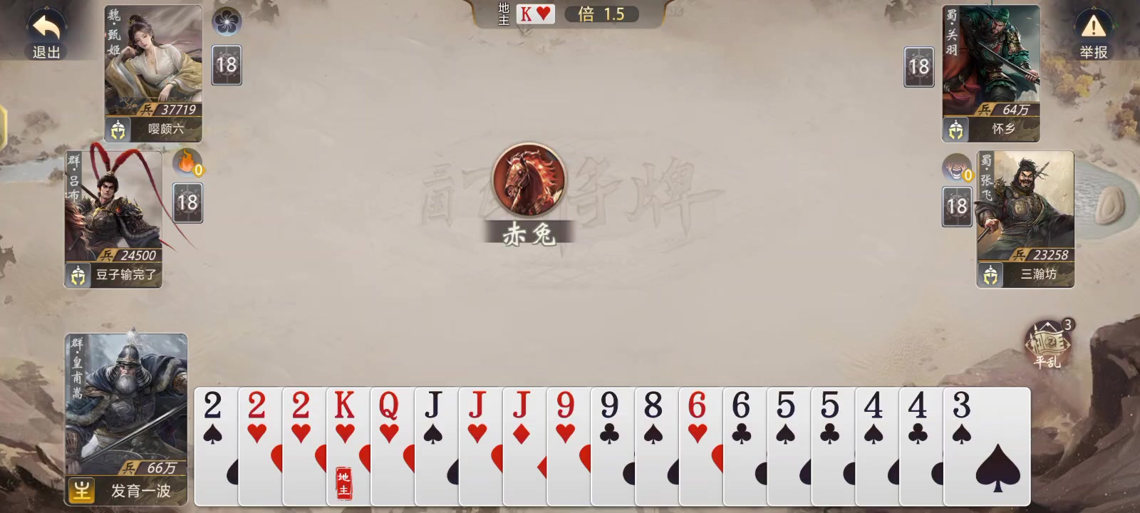 这游戏有时候真的不适合睿智玩 这局姜维牌真的算是天秀开局了,但我的牌虽然没地主好,但给的牌是真的好,给的每一张都是天选,本来是绝杀地主的,但碰到了这个睿智队友,真的是怎么打都白费 地主打出三带一后就剩5张牌,孙尚香3j竟然不管,我看地主出牌跟她开局就2A猜到她3J,我本来寻思地主5张牌她肯定会管,其实不管也无所谓 但后来管我对Q我是真不理解!她一手牌没出,地主一张牌,她拿对2压我对Q是什么脑回路,