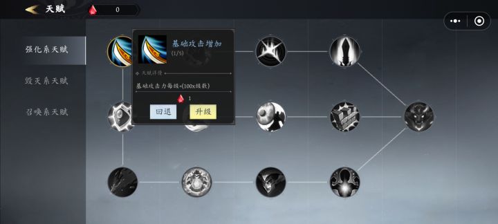 天赋分强化、毁灭、召唤三大类,每一类里面是横向的树状结构,很像暗黑的技能设定。可以自由选择加点和回退,尝试不同天赋强化效果。