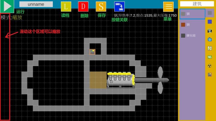 =====操作篇======两指触摸可以移动地图,滑动左边灰色条可以缩放=====基础篇======先按图摆放一艘小潜艇其中使用到的方块有:钢、柴油引擎、转轴、螺旋桨、柴油和无线接收器。柴油引擎会吸收周围能燃烧的方块作为燃料;无线接收器是潜艇的心脏,如果全部的无线接收器都被破坏,游戏就会结束;有了这些基本的方块,我们的潜艇就可以跑了。注意,大型方块是以左下角为原点放置的,如果放得