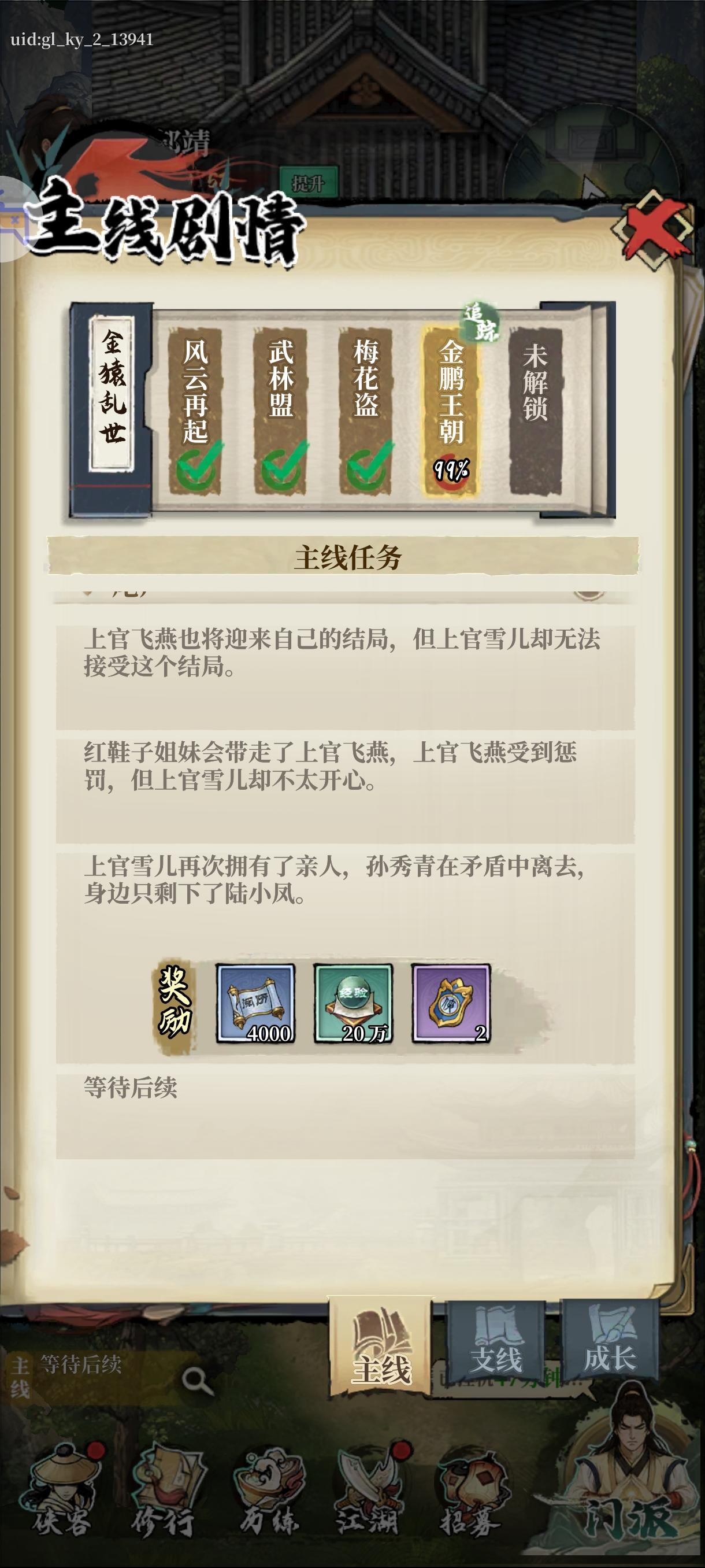 两天通关,略有瑕疵1.剧情部分冗长,互动可选项影响不大,沉浸感不强,建议做适当删节,部分情节可做文言文叙述增加深度,资金足够,希望用AI多配一些人物声音;2.氪金度,前期进阶丹比较缺,0氪微氪慢慢攒还能玩,卡关是正常的,侠客升级及装备加成高,升星收益在于连携级技能伤害升级,一星解锁连携即可,总体氪金度不高,小礼包弹窗多,可以无视或量力而行;3.人物形象上,各自有各自人设但主角仅从对话选项中突