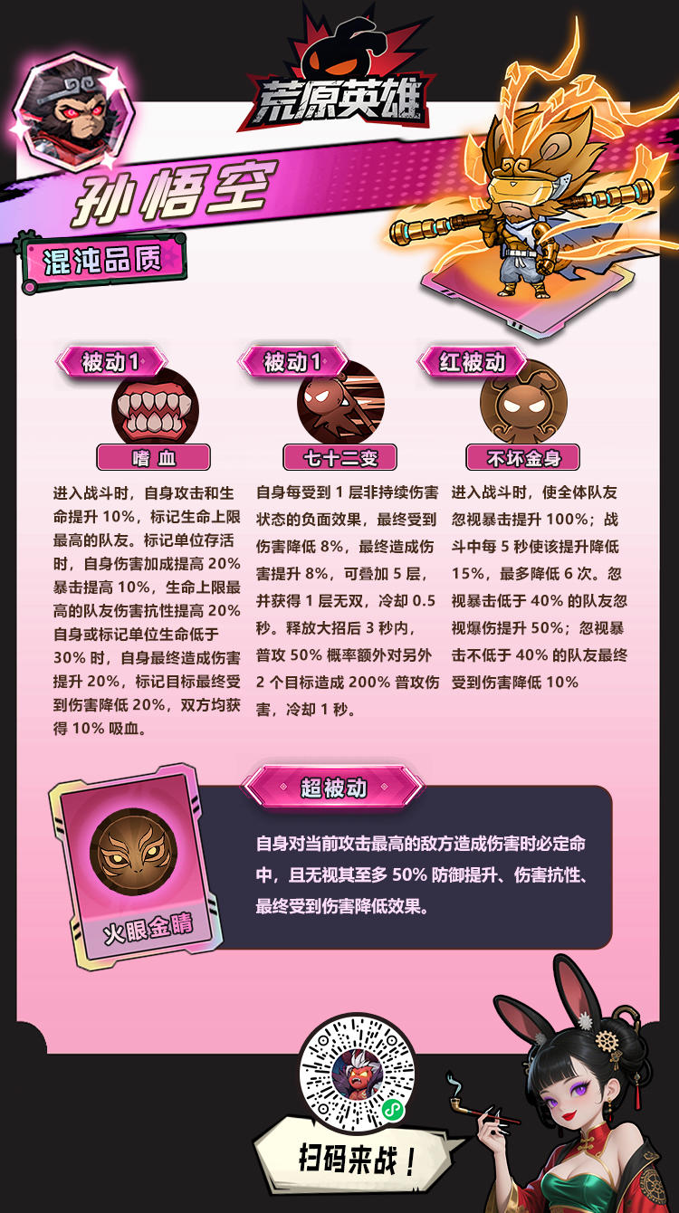 这个曾在小程序里杀疯了的 “荒原猴王”,带着【入场加伤 + 免控 + 吸血】【变身 72 变 + 免伤 + 攻速拉满】【全队增伤 + 免伤 + 暴击翻倍】,还有超燃的 “大品天仙诀” 超级被动,以及专属武器 “钛金金箍棒”+ 大招 “猴王大技”,直接把输出天花板焊死在 《荒原英雄》 新服 之前在小程序没来得及深交的朋友,这次 TapTap 新服刚启,正好能把这位 “老