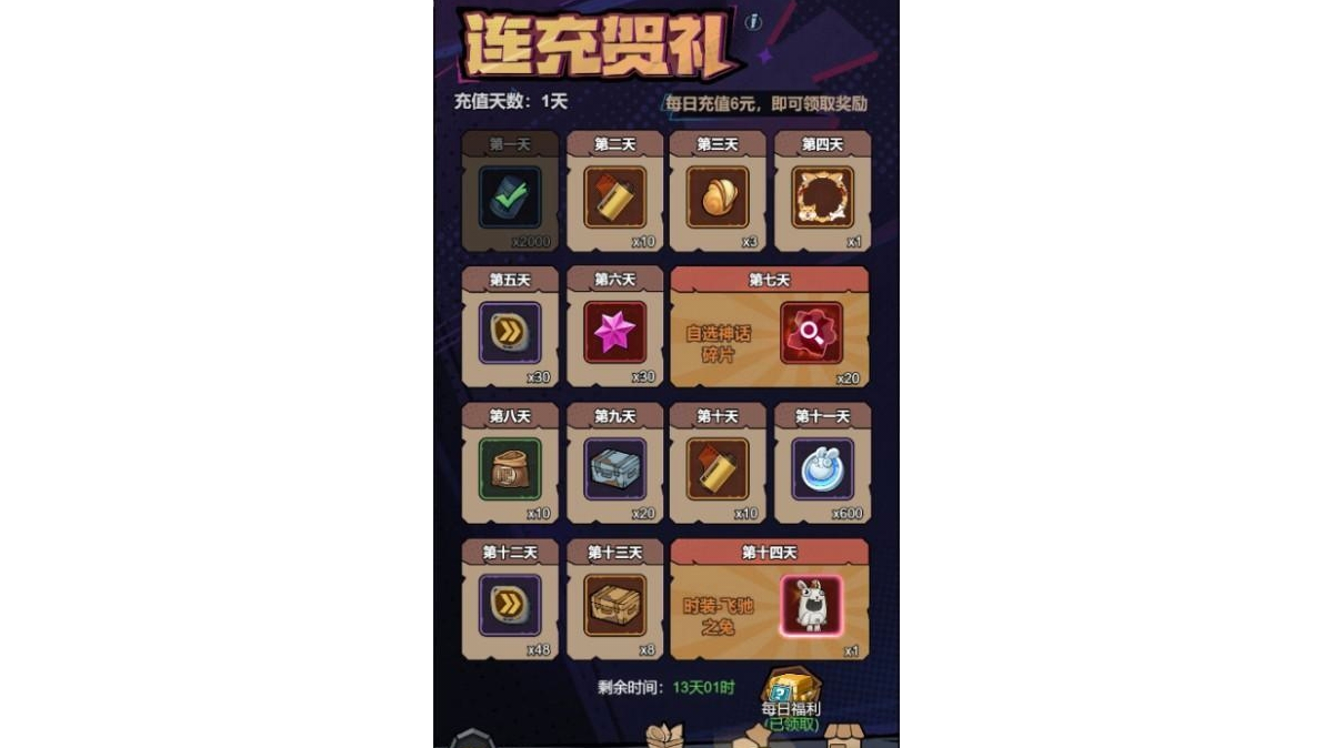 首先上线的是开服活动《连冲贺礼》活动持续14 天,参与14天可以获取开服绝版时装《飞驰之兔》 然后入场的是《累计充值》活动,活动持续7天,活动期间达成一定的条件可以获取开服绝版称号《末日金主》和开服绝版时装《恶魔人》荒原英雄3区T1乄9527uuid:20004700115