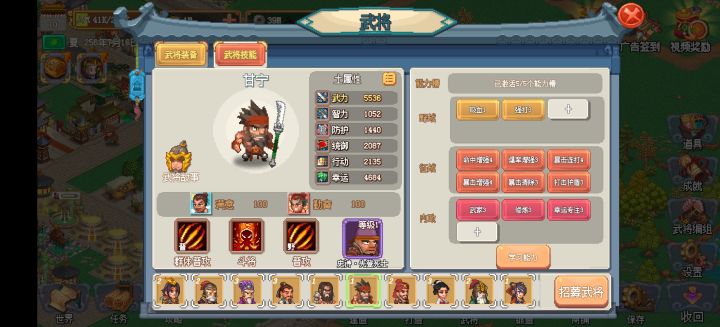 这游戏主要战斗材料获得分为关卡征战和地图野战,前期看视频买完武将,前期主要培养甘宁主力部队征战一队野战2队野战一队主要boss五个成员满野战六个技能槽所有技能分开点不要重复,吸血每个都可以有内政开到2个就够了主要学习武力(智力)以及行动3个槽的加幸运,征战开关和通关塔的搭配(吕蒙设置怒气释放配合孙权怒气释放顺序2吕蒙1孙权另外搭配肉盾周泰周泰不做需要学习专属技能甘宁也是一样的周泰打击护盾闪避重击衰