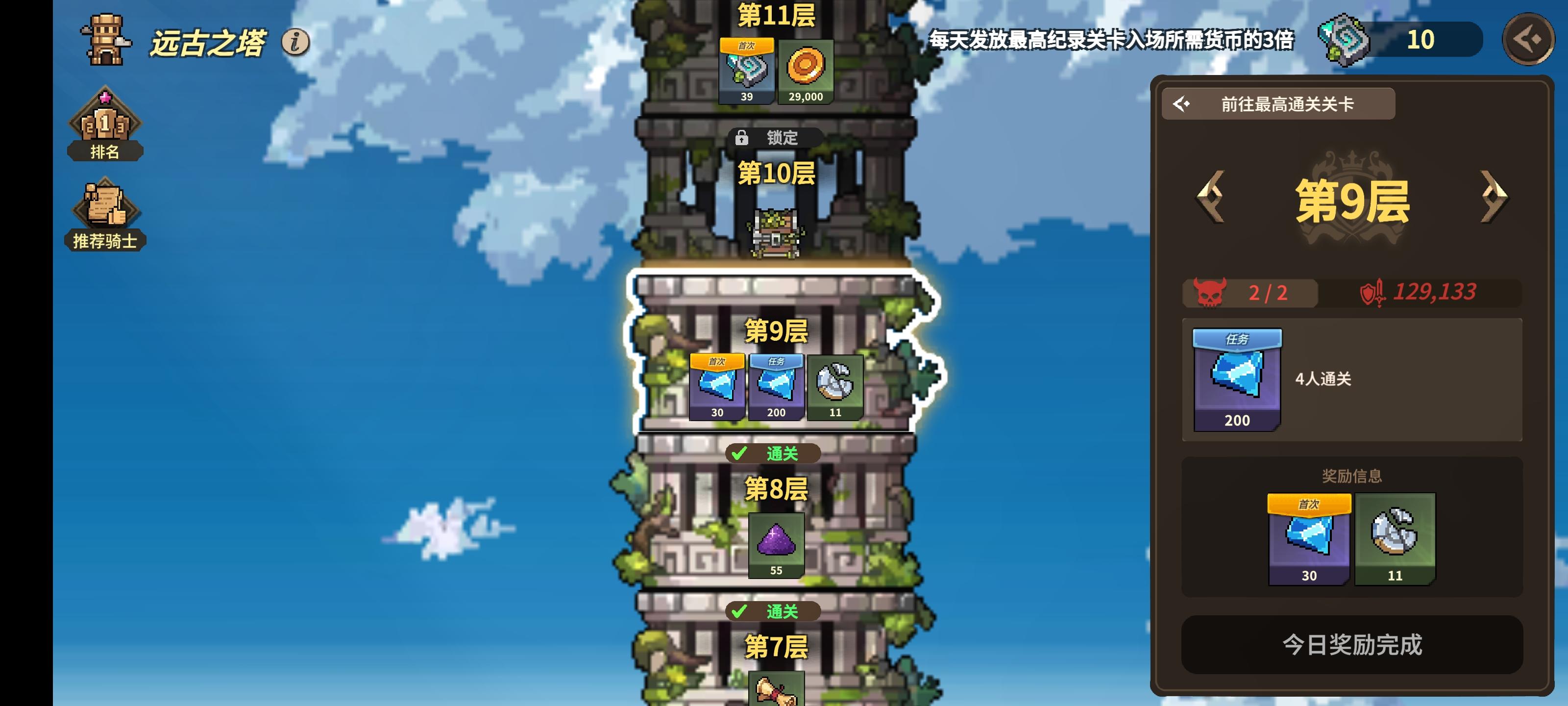 我想问一下各位,远古之塔失败一次就不让再打了吗?显示今日奖励已领取,不能再挑战最高层,我现在9层失败一次就卡在这里了不能再打了。