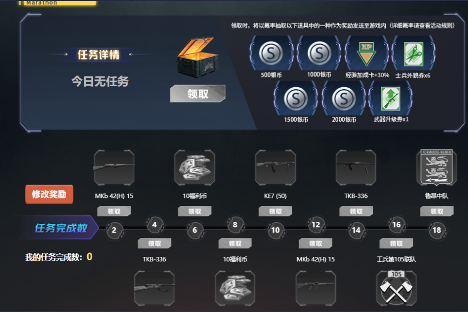 各位指挥官们大家好! 新一期马拉松活动即将震撼来临!每日完成任务,即可免费领取强力武器!马拉松活动持续21天,每天可以完成一次任务,完成一次任务可以获得一个宝箱,宝箱内包含银币、经验加成等各类资源。同时,根据您完成的任务总数,您还能解锁不同的丰厚大奖。马拉松优化,奖励可以自己选择,在未领取奖励前可以随时修改。=活动时间=2月1日 15:00 至2月22日 14:58=奖励展示=全新
