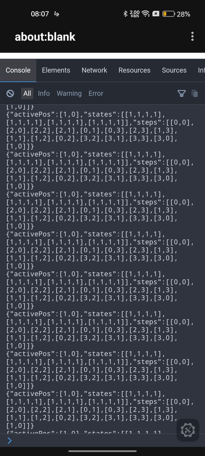 red49关各个点开始分别有这么多种解法[ [128, 448, 384, 160], [384, 1152, 256, 352], [128, 256, 1088, 352], [64, 192, 512, 176]]所以从第二排第二列最容易试出来解法程序暴力求解的代码太长就不放了(图中steps键为顺序列表,里面的每个列表元素是x和y坐标,第x+1列,y+1排)