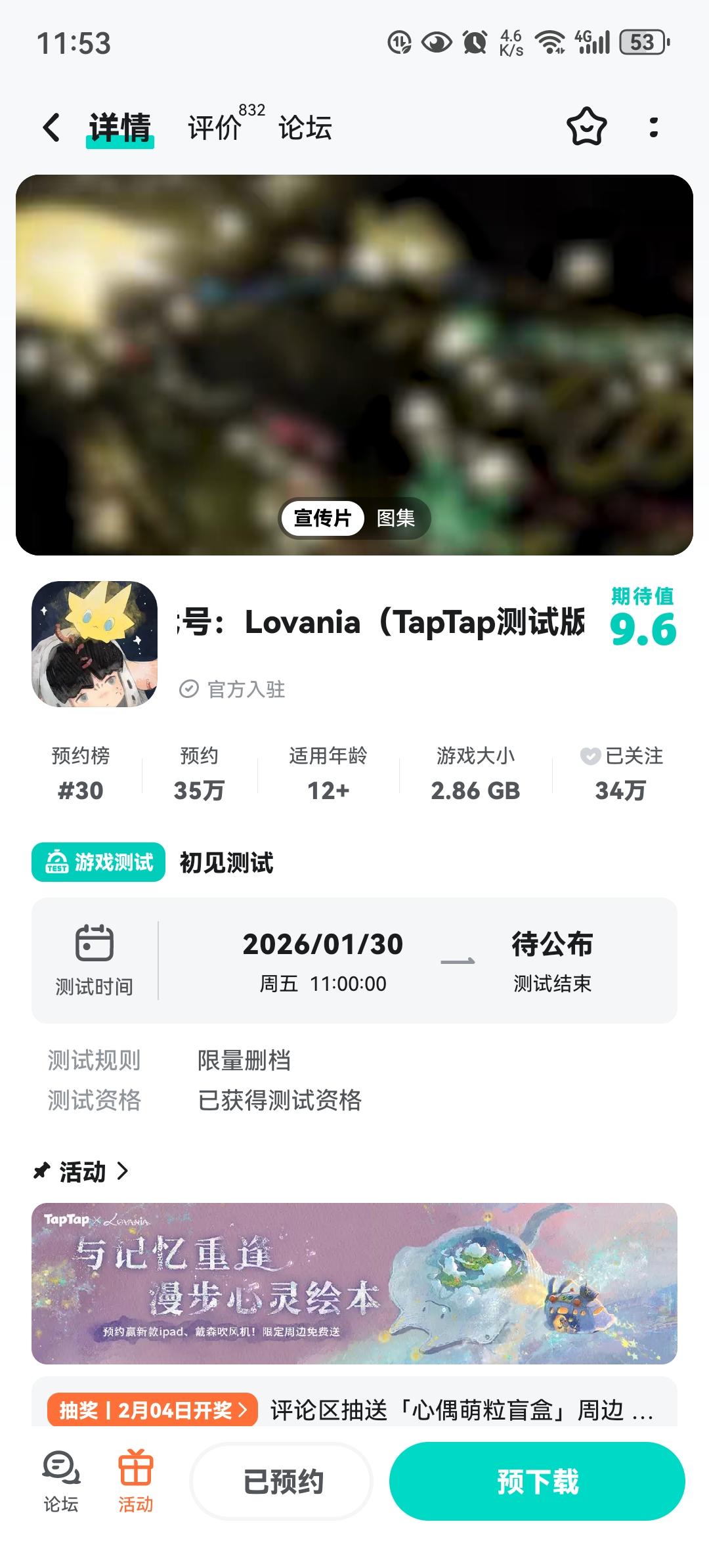 小人偶,久等啦!《Lovania》超超超前期「初见测试」资格陆续发放中,请小人偶注意查收来自不忘乡的邀请,与你的“初见”,即将开始—— ☆资格发放时间&方式☆•发放时间:2026年1月28日起陆续发放,请小人偶注意查收~•发放方式:TapTap站内信 ☆测试信息☆•测试时间:2026年1月30日11:00 •测试平台:仅支持安卓系统手机端(不包含鸿蒙系统及模拟器)•测试类型:小规