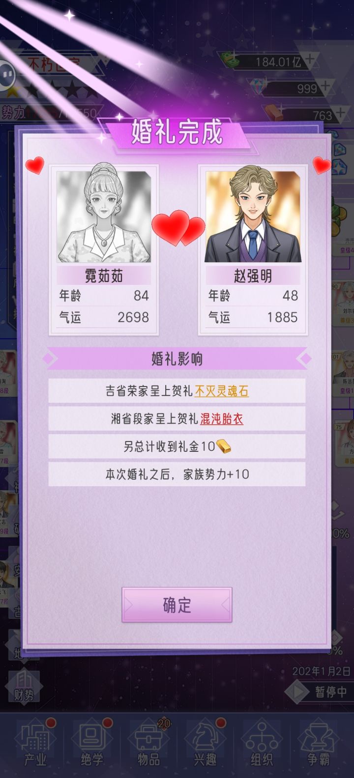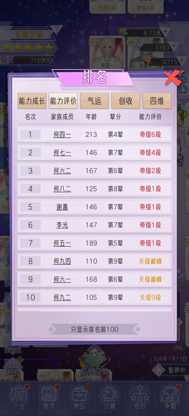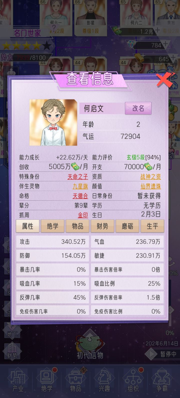 1. 玩了几天,和修仙世家差不多的套路,开局尽可能人少点,能集中资源刷气运。 气运越高,生的孩子气运越高。气运值决定经验速度和赚钱速度。出生气运决定联姻的质量,生娃时候的气运决定孩子资质。想要家族整体潜力快速拉高,头两个孩子只能放弃,前期家主刷气运,50岁以后再生老三老四来传宗接代。第三代开始就不需要卡年龄了,直接生,后面都靠抓周抓到金印+100%气运。2. 颜值,命格,日常身份不强求,后
