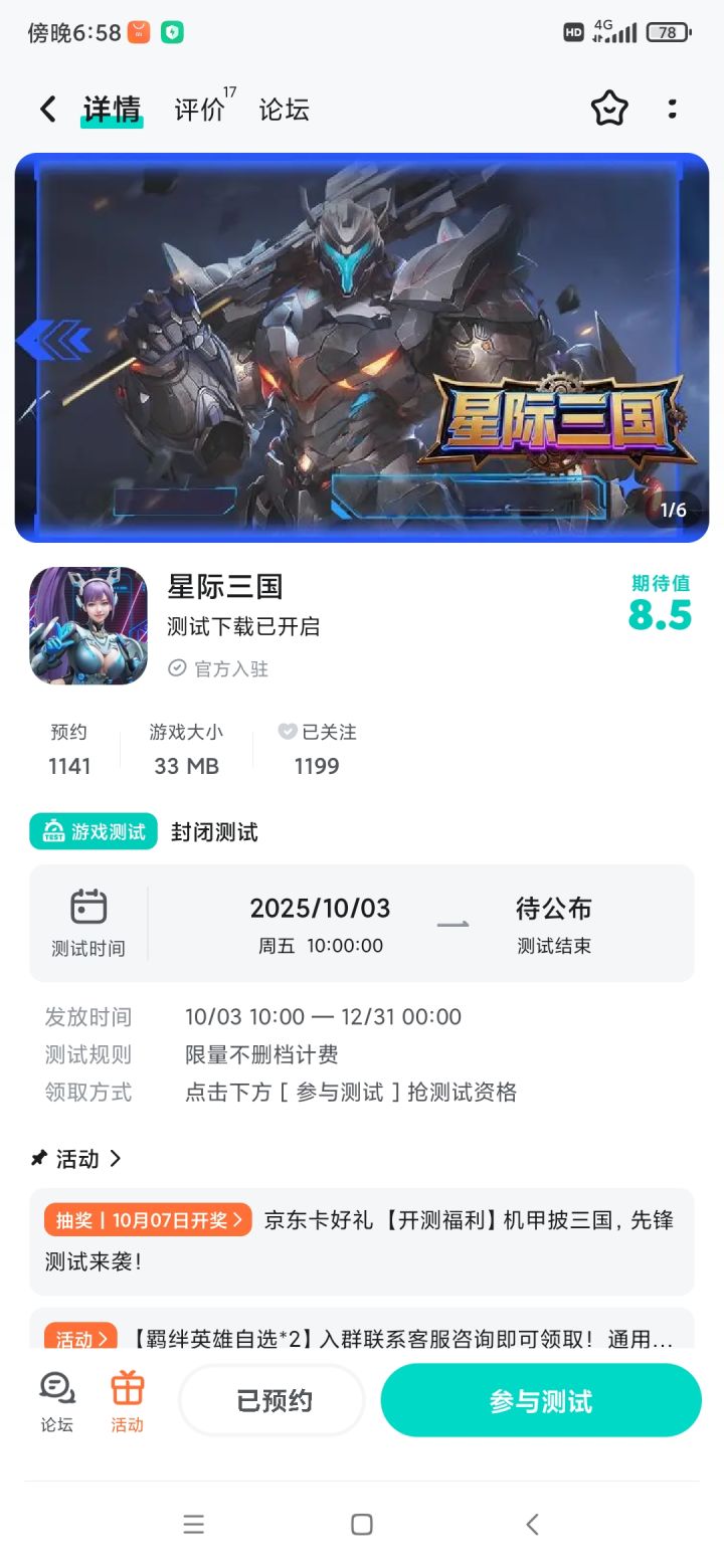 当三国名将披上星际机甲铠甲,当传统兵法碰撞未来科技 ——《星际三国》先锋测试 10 月 3 日正式上线!在这里,你将以诸侯之姿,统领钢铁军团纵横银河,用策略与武力改写三国乱世格局!🔥开测时间:2025 年 10 月 3 日 10:00为了感谢大家的耐心等待,我们特别准备了京东卡抽奖活动。只需轻松参与,就有机会赢得100元京东卡好礼,千万不要错过!【京东卡抽奖活动】▶ 参与方式1.点击关注
