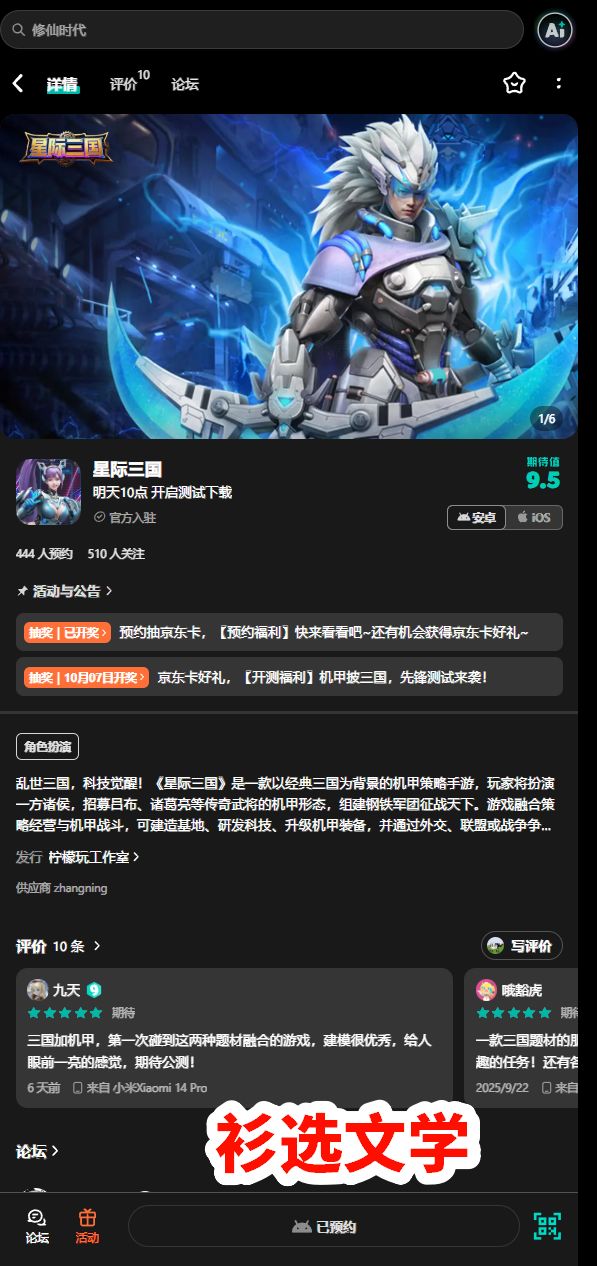 当三国名将披上星际机甲铠甲,当传统兵法碰撞未来科技 ——《星际三国》先锋测试 10 月 3 日正式上线!在这里,你将以诸侯之姿,统领钢铁军团纵横银河,用策略与武力改写三国乱世格局!🔥开测时间:2025 年 10 月 3 日 10:00为了感谢大家的耐心等待,我们特别准备了京东卡抽奖活动。只需轻松参与,就有机会赢得100元京东卡好礼,千万不要错过!【京东卡抽奖活动】▶ 参与方式1.点击关注