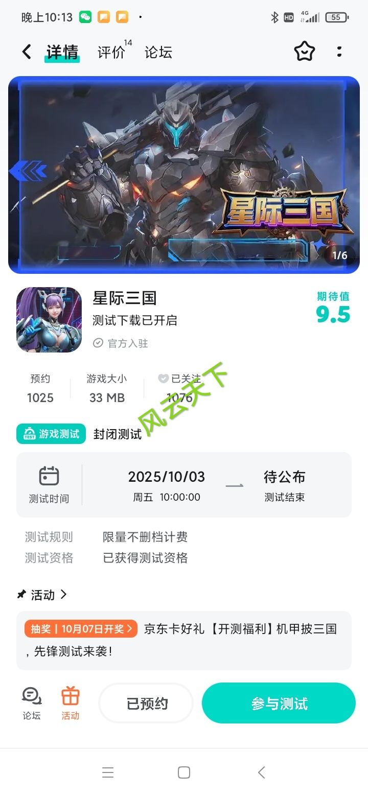 当三国名将披上星际机甲铠甲,当传统兵法碰撞未来科技 ——《星际三国》先锋测试 10 月 3 日正式上线!在这里,你将以诸侯之姿,统领钢铁军团纵横银河,用策略与武力改写三国乱世格局!🔥开测时间:2025 年 10 月 3 日 10:00为了感谢大家的耐心等待,我们特别准备了京东卡抽奖活动。只需轻松参与,就有机会赢得100元京东卡好礼,千万不要错过!【京东卡抽奖活动】▶ 参与方式1.点击关注