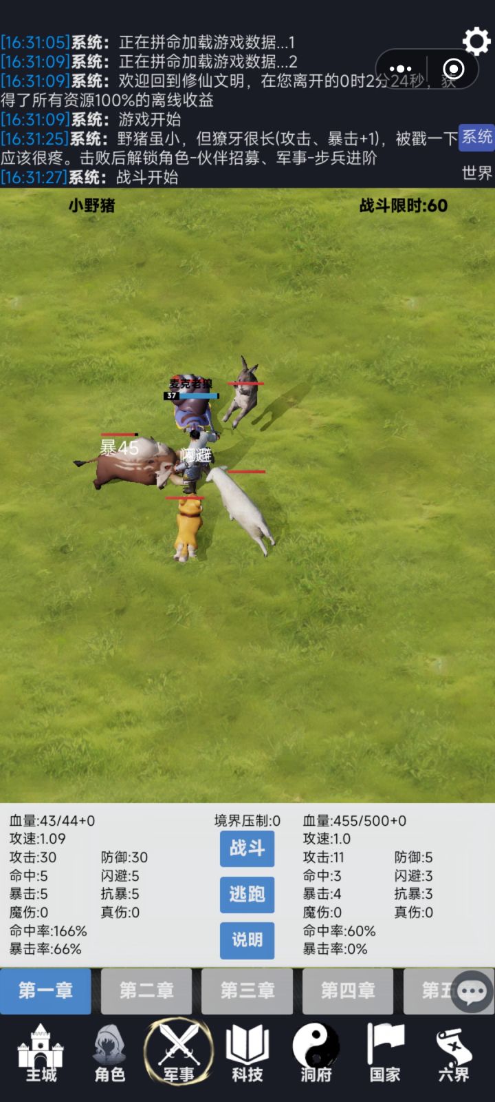 军事界面的探索战斗部分有图形化界面,过程完全自动化,无需手动控制,但无法进行加速。探索分章节和关卡制,数值卡点非常明显,令人匪夷所思。在有了士兵时候可以进行大规模战斗,这个时候就比较考验经济支撑能力了,应了那句古话:兵马未动粮草先行。