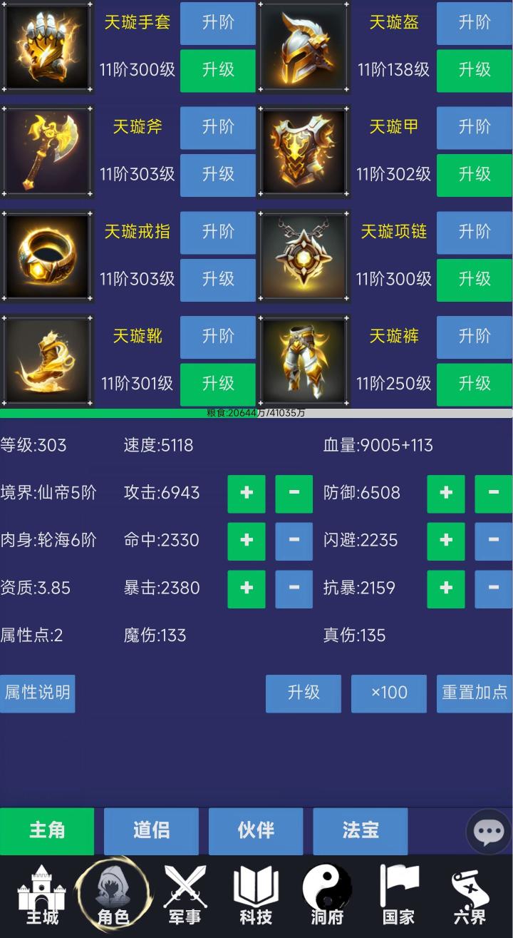 角色包括主角、道侣、伙伴等,UI还有空位,功能未解锁前UI是隐藏的。主角需要粮食来升级,每升一级获得两个可分配属性点,可自由分配到六维属性中,有推荐加点和加点说明。另有装备系统,是直接穿身上自带的,可以消耗金币来升级,消耗玄铁可升阶,所需资源数量较大,养成提升缓慢。