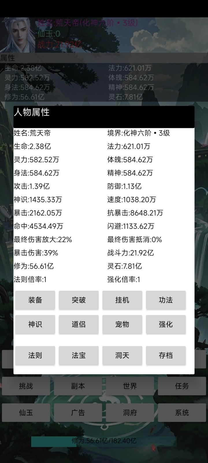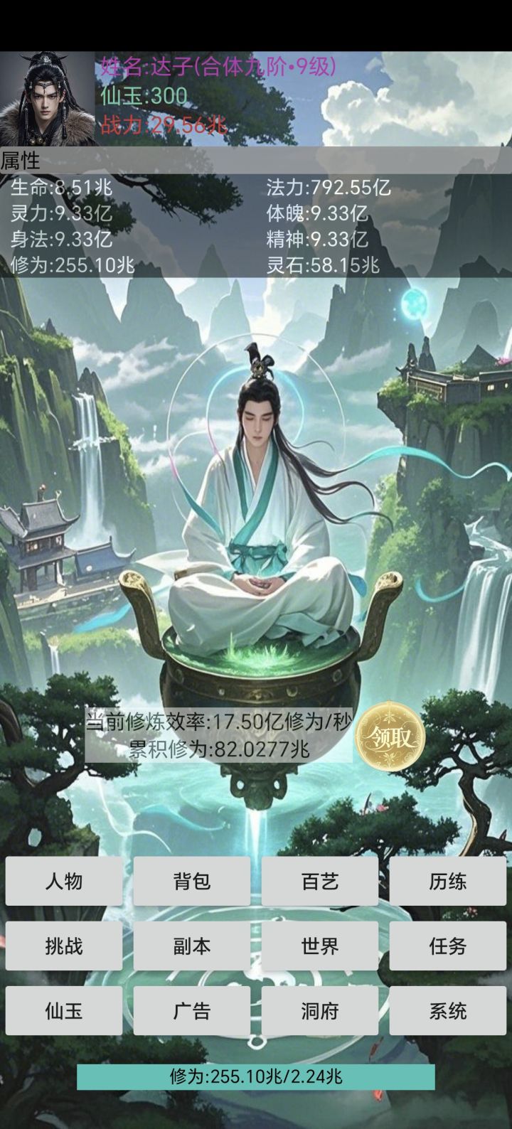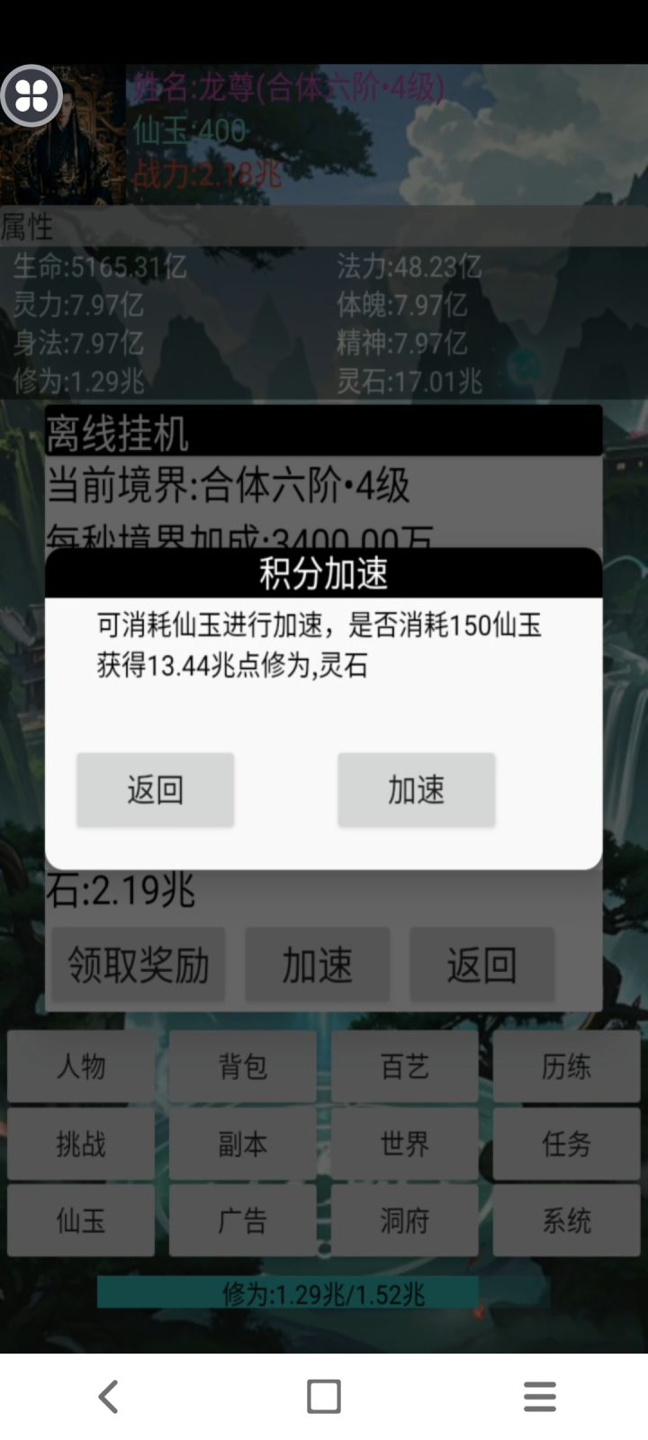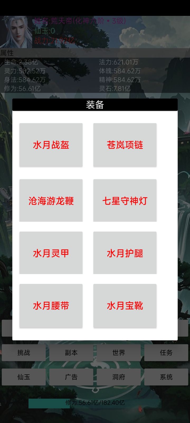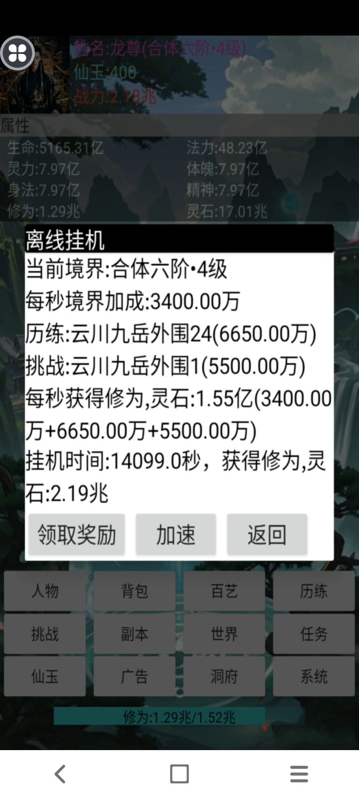 今天第9天了 现在提升到了化神六阶 今天的操作又是重复的一天。基本上就是看广告。拿仙石加速修为突破。按照这样的进度,明天应该可以差不多上练虚了。最最近有很多很多兄弟想要知道我这个挂机心得,我大概讲一下。提升大境界后的第一天是很重要的。因为你要推图把那个修为获取速度提升 大概要做以下几点。1.你第一件事就去新地图里面去买那个装备。买三件装备就够了.武器 护甲和护腿 买完这三件装备就可以去刷装备