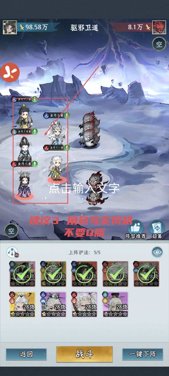 今天开测,玩下来感觉十分好玩,立绘也是十分精美但是有一些建议希望采纳1、角色能否更新一个女角色,不然只有男角色选择性太低2、人物界面单一,目前只支持头像更换,如果改成可以选择已获取护法作为展示界面,效果也是十分好,能够充分展示游戏里面各种角色精美立绘,玩选择性也是十分多!不然每次点开别人的个人信息都是显示同一个人物,结果就是太单一,完全没有吧各个护法的精美立绘能够全面的展示出来!!比如说出