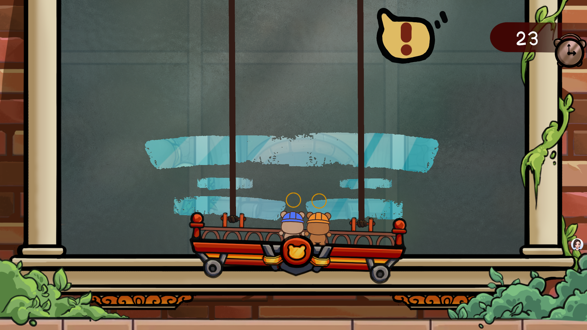 玩法有点像双人合作游戏(当然一个人也能同时操作两只小熊),主要内容就是擦干净玻璃,awsd和方向键分别操控两只小熊,左右键控制小熊,上下调整缆绳的高度。小熊无法直接移动,只能靠惯性移动,蓄力能够控制毛巾的大小,蓄力时间越长,毛巾越大,擦窗户的面积越大,小熊移动的距离也越大。根据惯性和重力,吊车的平衡会产生变化,从而清理更多的角落。需要注意的是,无法直接使用上下键调整缆绳的高度,只有小熊在系绳子附近的地方才能控制调整高度。在擦玻璃的过程中,会有从天而降的仙人掌和飞行中的鸟,需要躲避这些东西,不然就会被撞晕几秒钟。在障碍物出现之前有明显的感叹号提示,但由于移动是靠惯性,而并非直接移动,升降也需要移动到对应的位置才能操作,因此躲避障碍物还是比较不容易的。