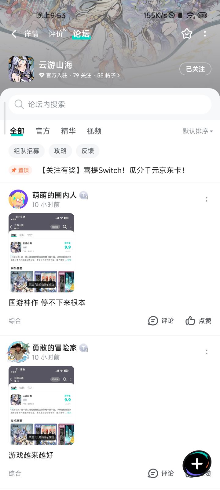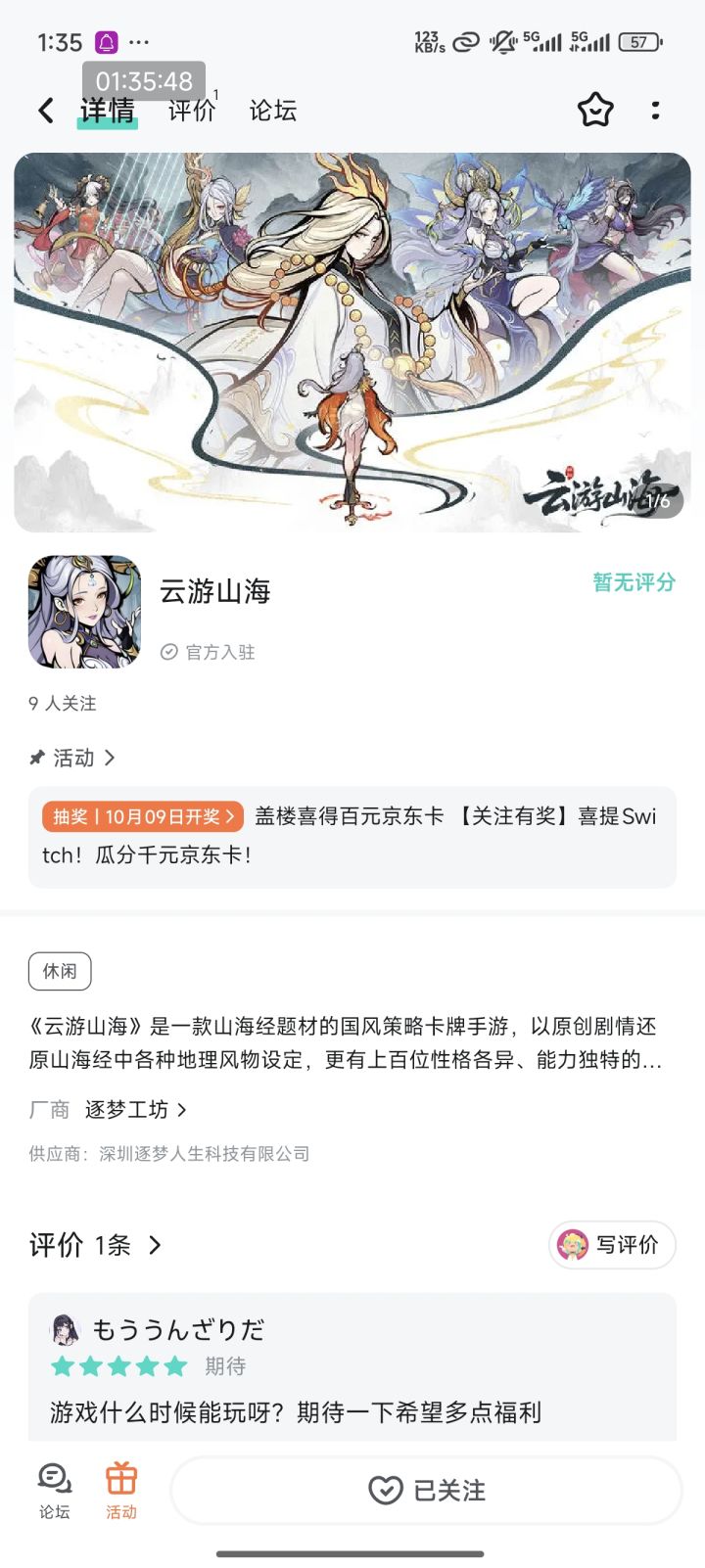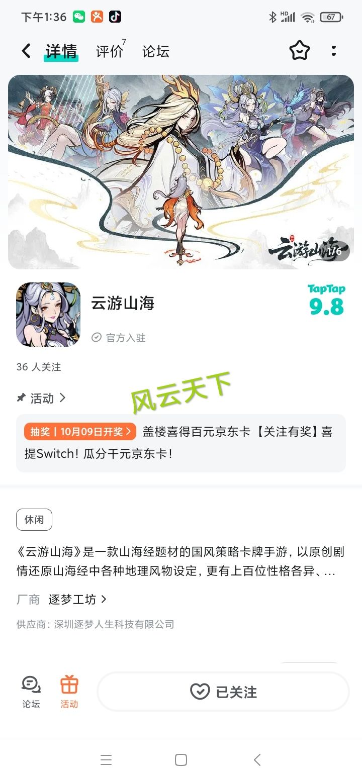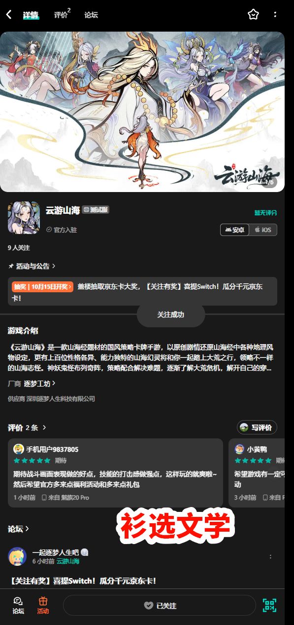 《云游山海》是一款山海经题材的国风策略卡牌手游,以原创剧情还原山海经中各种地理风物设定,更有上百位性格各异、能力独特的山海幻灵将和你一起踏上大荒之行,领略不一样的山海志怪。神妖鬼怪布列奇阵,策略配合解决难题,逐渐了解大荒危机,解开自己的穿越之谜!我们将于近期上线测试,现开放关注,大家快快参与抽奖活动吧!【参与方式】1、在社区板块「云游山海」中发布新帖,晒出各位的关注截图,注意:截图必须在社