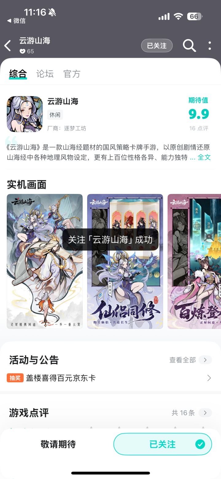 《云游山海》是一款山海经题材的国风策略卡牌手游,以原创剧情还原山海经中各种地理风物设定,更有上百位性格各异、能力独特的山海幻灵将和你一起踏上大荒之行,领略不一样的山海志怪。神妖鬼怪布列奇阵,策略配合解决难题,逐渐了解大荒危机,解开自己的穿越之谜!我们将于近期上线测试,现开放关注,大家快快参与抽奖活动吧!【参与方式】1、在社区板块「云游山海」中发布新帖,晒出各位的关注截图,注意:截图必须在社