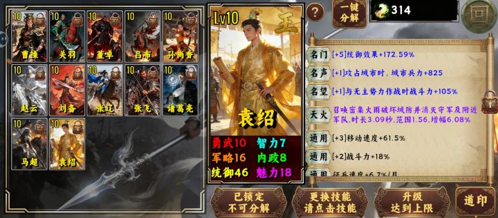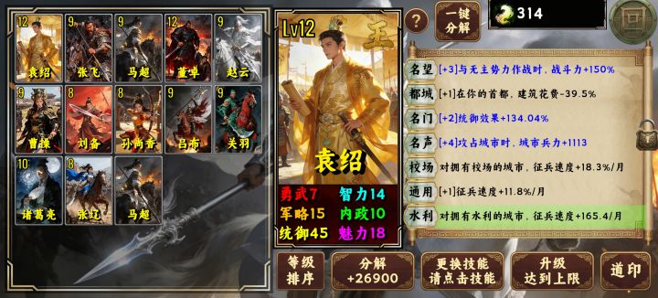 剧情模式:多数图可用董卓,技能人口,主动选加人口加兵退敌都行,有印选内政,找个角落开75%路线,先做兵营,政策人口,改指数成长关Ai建筑,有盟友解掉基本除火绕新野,赤壁等少数图天神都能过,过不了再刷点印吧。少数图选诸葛亮孙尚香袁绍,养成高了选己喜欢的都行。有些图没养成真的很难打。自由模式:人口技能内政属性角落指数成长关Ai天神通关都不难天道试练:目前本人卡在15,所有英雄中袁绍感觉现这模式更适