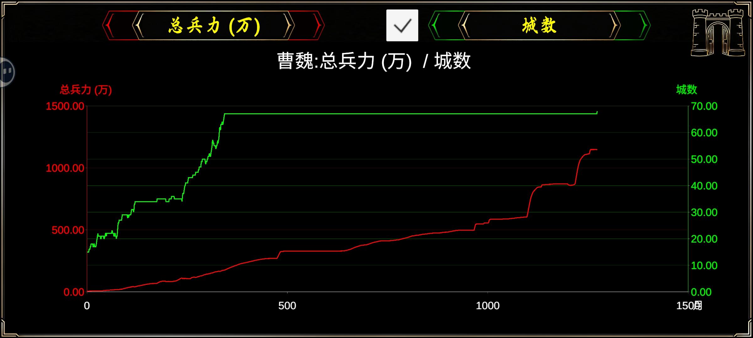 游戏结束后会显示本局内各项数据按月变化情况目前分11项:"总兵力 (万) ", "征兵 (/月) ","总人口 (万) ", "人口增长 (/月) ","黄金 (万) ", "税收 (/月) ","杀伤 (万) ", "伤亡 (万) ","城数 ", "攻破 ", "沦陷 ",可以同时显示两项.