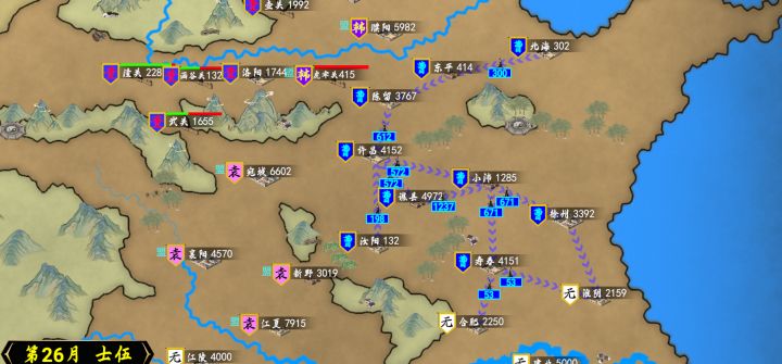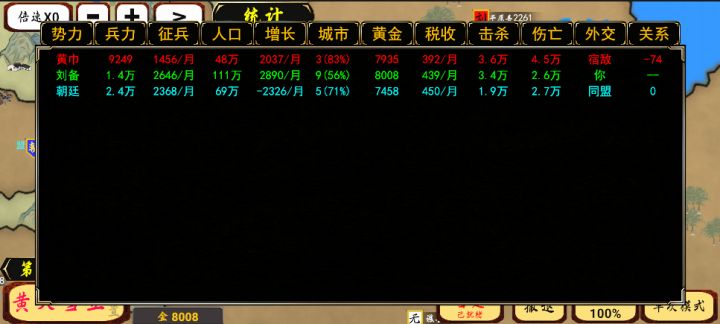 游戏结束后会显示本局内各项数据按月变化情况目前分11项:"总兵力 (万) ", "征兵 (/月) ","总人口 (万) ", "人口增长 (/月) ","黄金 (万) ", "税收 (/月) ","杀伤 (万) ", "伤亡 (万) ","城数 ", "攻破 ", "沦陷 ",可以同时显示两项.