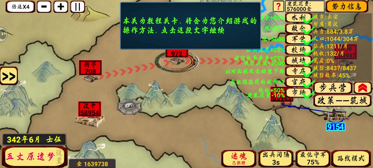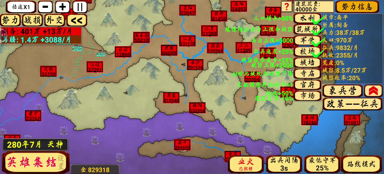 首先,刷个爆黄金快的角色(我选的袁绍) 然后,选个边境且有地势阻挡的城市(我选的云南) 再选一个你认为后期牛逼的势力(我前期选了成都刘,后面换了大皇帝孙权) 开局点市场,开四倍速,开局技能随便,建议增益或削弱(增益保证自己不会被干死,削弱就削弱你选爹旁边的那几个势力) 至于局内技能,首选至多一个城池,守城/战力增加的技能;或者增加你黄金数量的技能 然后,点满市场,水利,筑墙所,寺庙后,疯狂给你的大