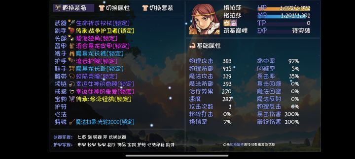 不凹神妙和小属性,心法还在肝五色小明,炎柱猫,碧海潮生修女,一念花开维利亚,奶奶没啥可说的带个复活手套带个佛灯当半个奶,科勒盾妹暂时用着斗气化马和狮吼,没玩天剑也没盾的技能先这么用着,修一想玩法已经没有强势的法系技能空缺了先空学,流云狂战士,战争投掷王烈,太刀里德也没啥特别强势的技能,死神扫射巴洛克,阎王帖栗子头,奥术飞弹瓦莱丽,降龙铁山岳戒指项链除了流云流派必带,我都带着女神套,毕竟刷子游戏
