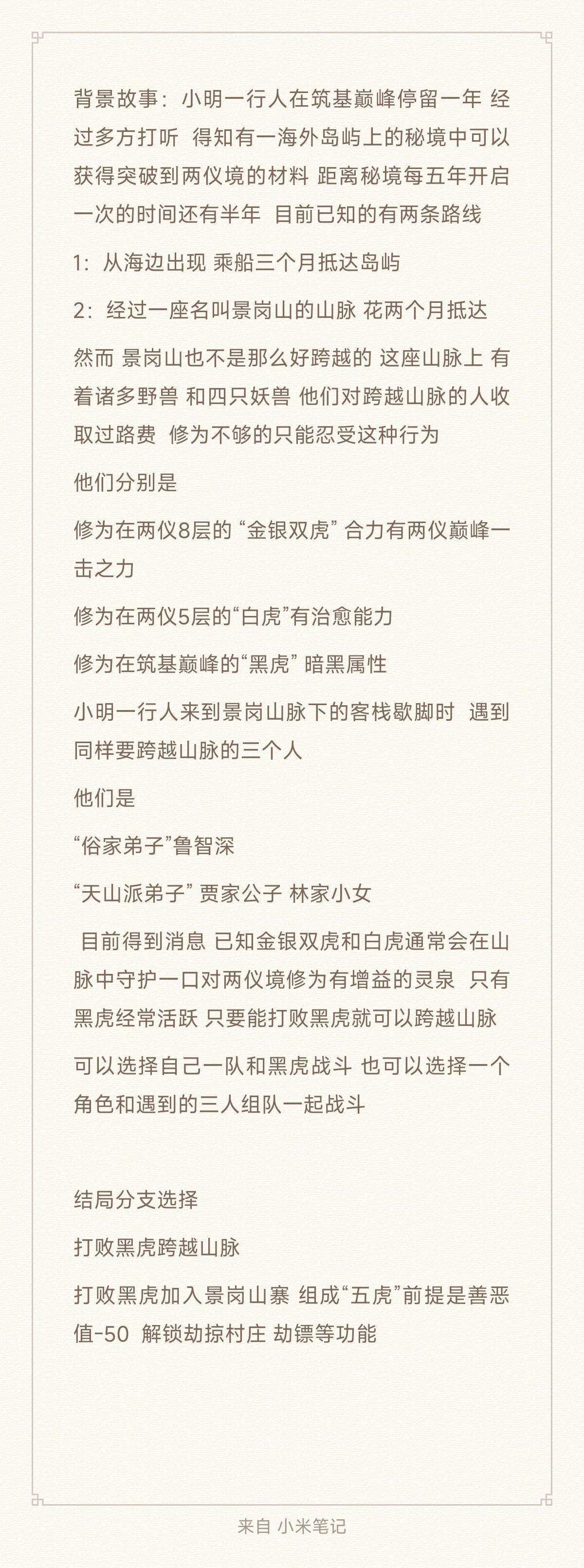 背景故事:小明一行人在筑基巅峰停留一年 经过多方打听 得知有一海外岛屿上的秘境中可以获得突破到两仪境的材料 距离秘境每五年开启一次的时间还有半年 目前已知的有两条路线 1:从海边出现 乘船三个月抵达岛屿2:经过一座名叫景岗山的山脉 花两个月抵达然而 景岗山也不是那么好跨越的 这座山脉上 有着诸多野兽 和四只妖兽 他们对跨越山脉的人收取过路费 修为不够的只能忍受这种行为他们分别是 修为在两