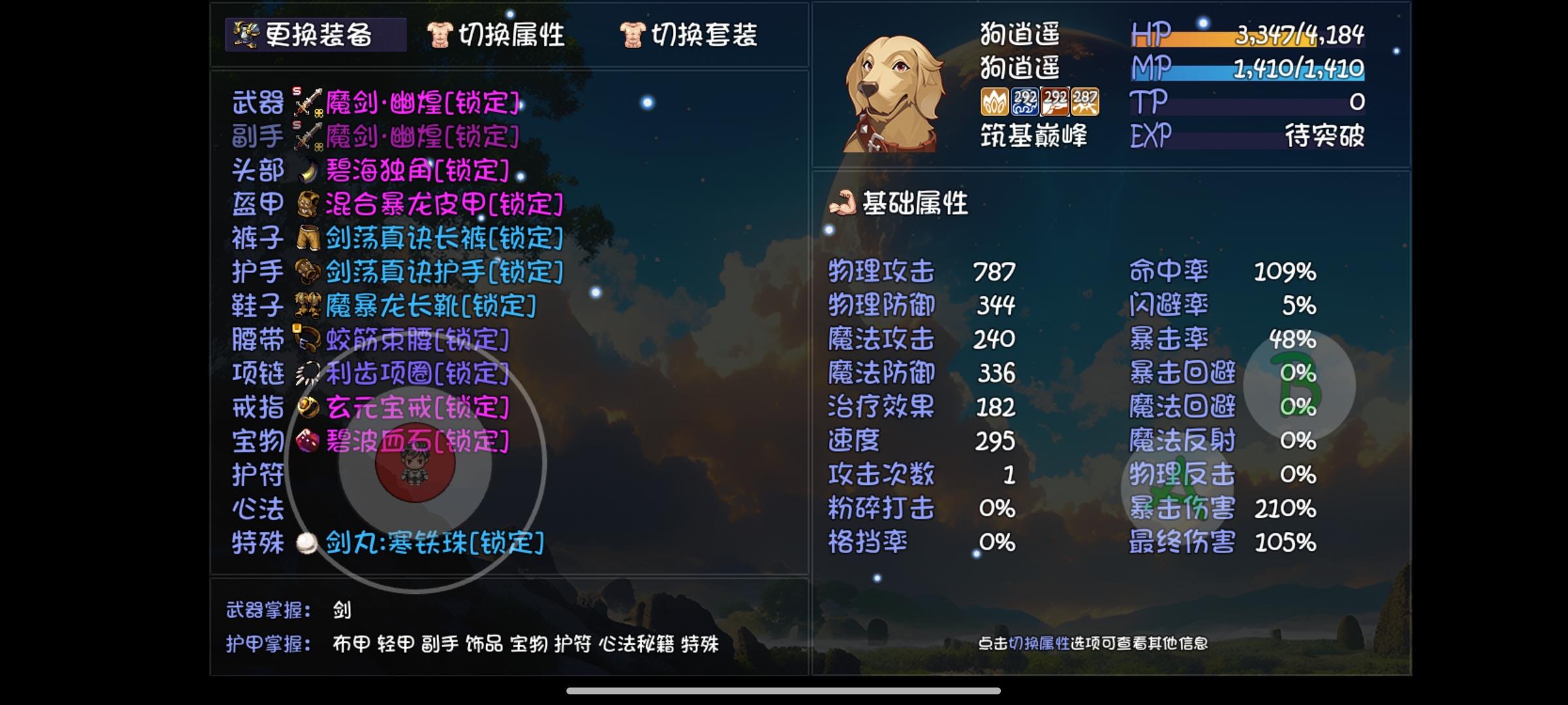 整个副本是不是只有蛟龙筋跟剑魔的魔剑幽煌对我有用了双长生诀,但是因为套装原因我只能装两个幸运女神,要是都没用的话我就直接打五色结了