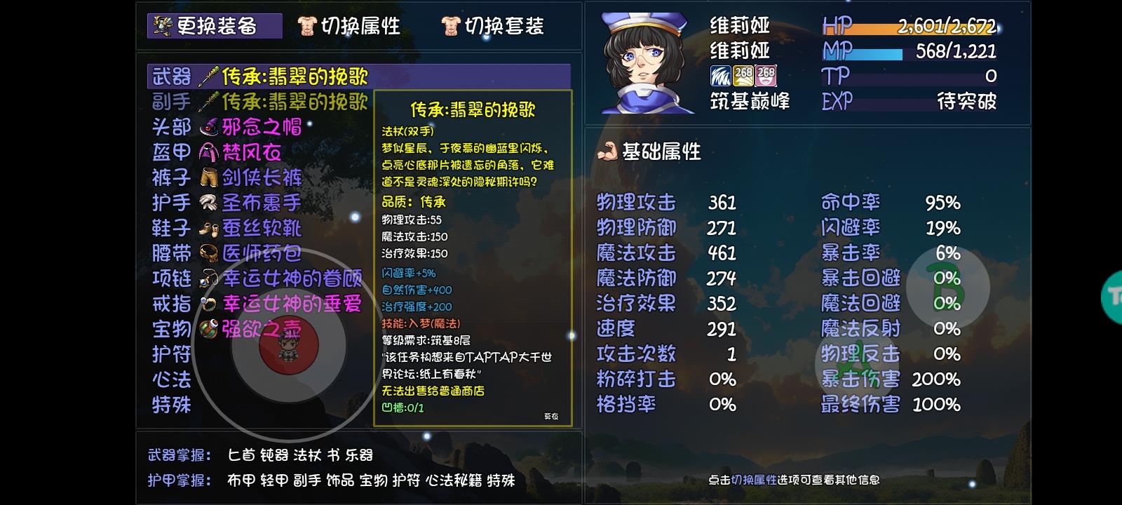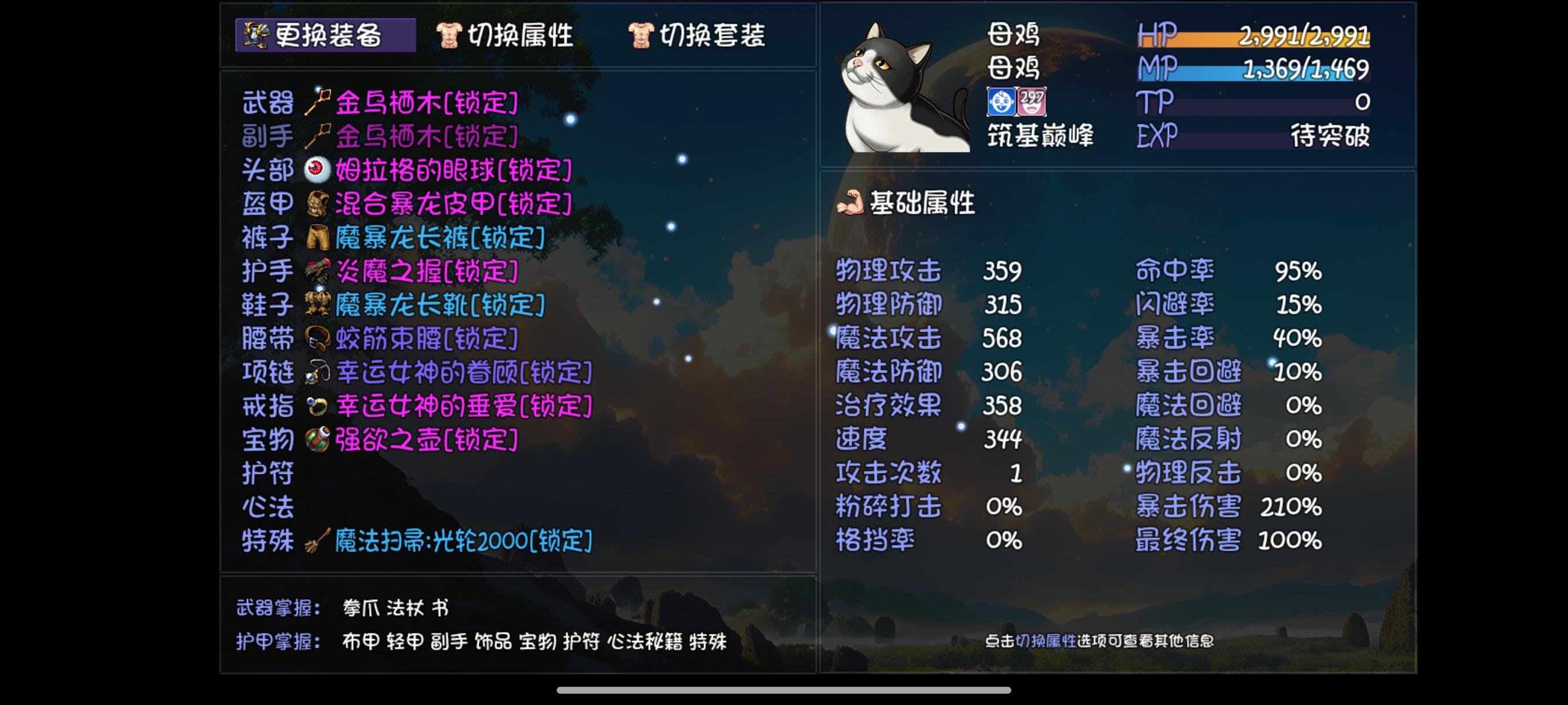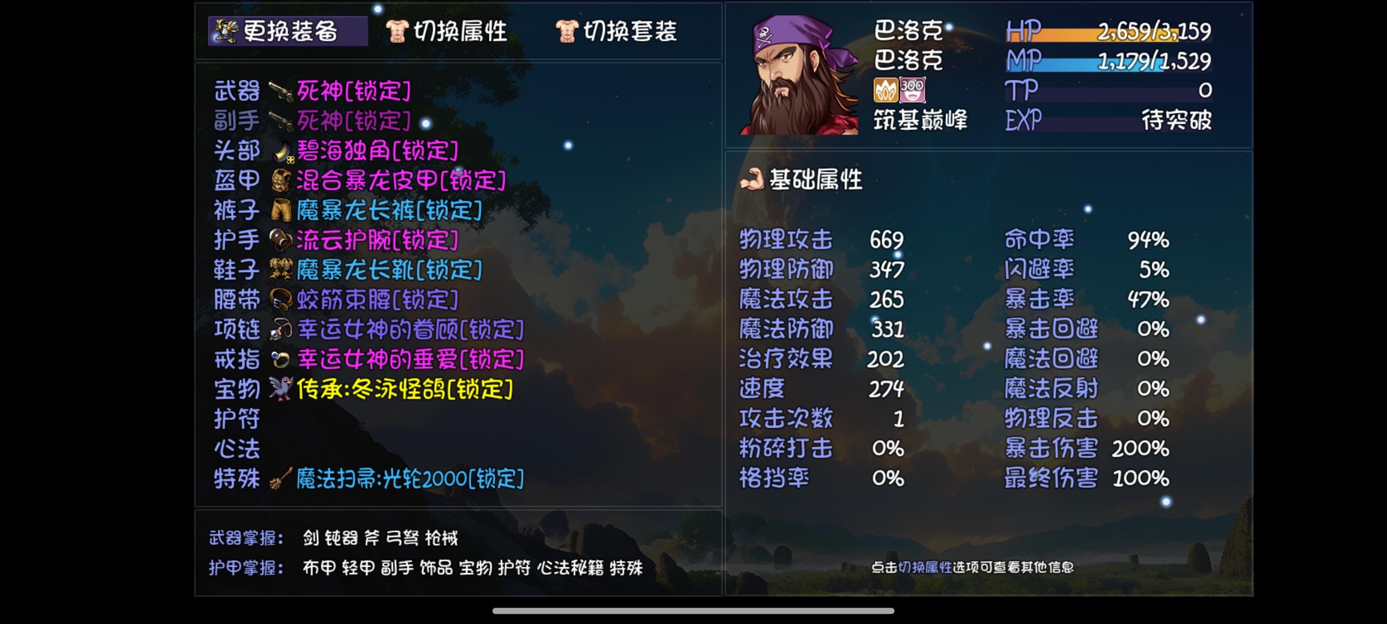 不凹神妙和小属性,心法还在肝五色小明,炎柱猫,碧海潮生修女,一念花开维利亚,奶奶没啥可说的带个复活手套带个佛灯当半个奶,科勒盾妹暂时用着斗气化马和狮吼,没玩天剑也没盾的技能先这么用着,修一想玩法已经没有强势的法系技能空缺了先空学,流云狂战士,战争投掷王烈,太刀里德也没啥特别强势的技能,死神扫射巴洛克,阎王帖栗子头,奥术飞弹瓦莱丽,降龙铁山岳戒指项链除了流云流派必带,我都带着女神套,毕竟刷子游戏