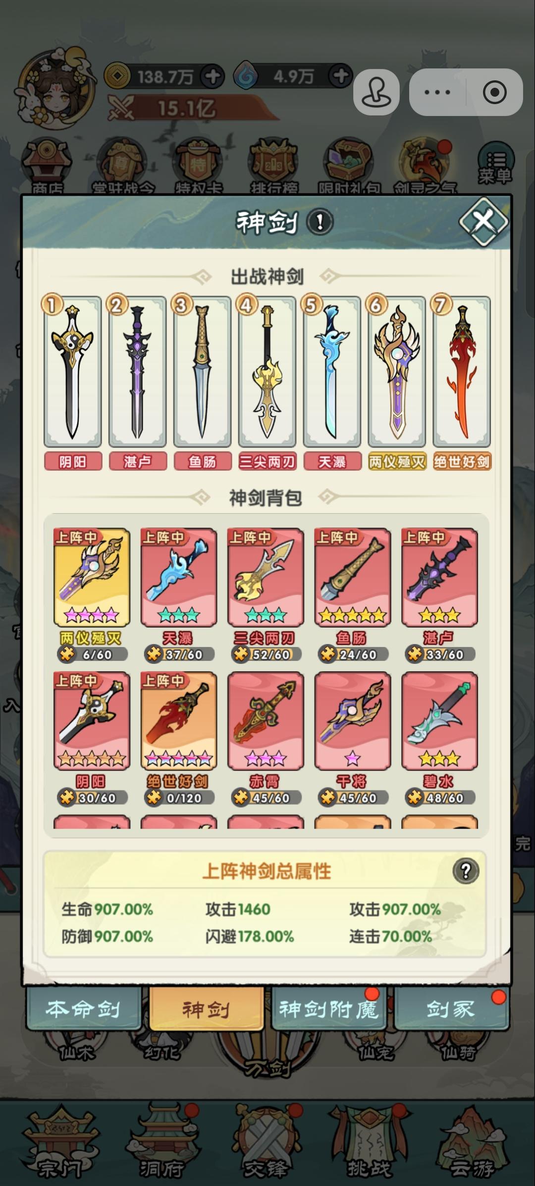 神剑:一共可以上7把,靠剑冢消耗剑符抽取并升星。前期上5橙1红1金,一个月后,红剑升得差不多就可以换上去使用,1金5红1橙,橙剑绝世好剑继续用。