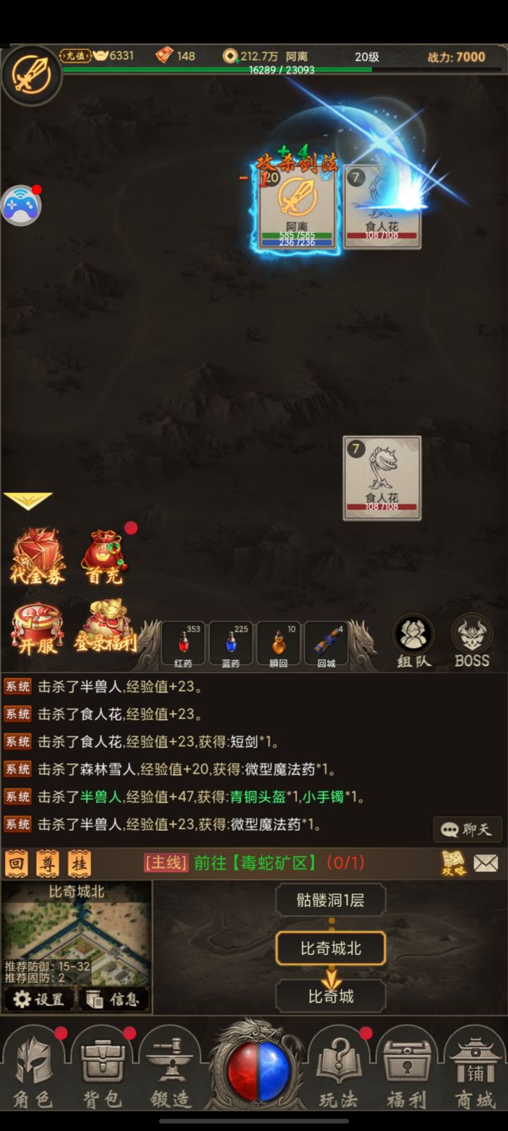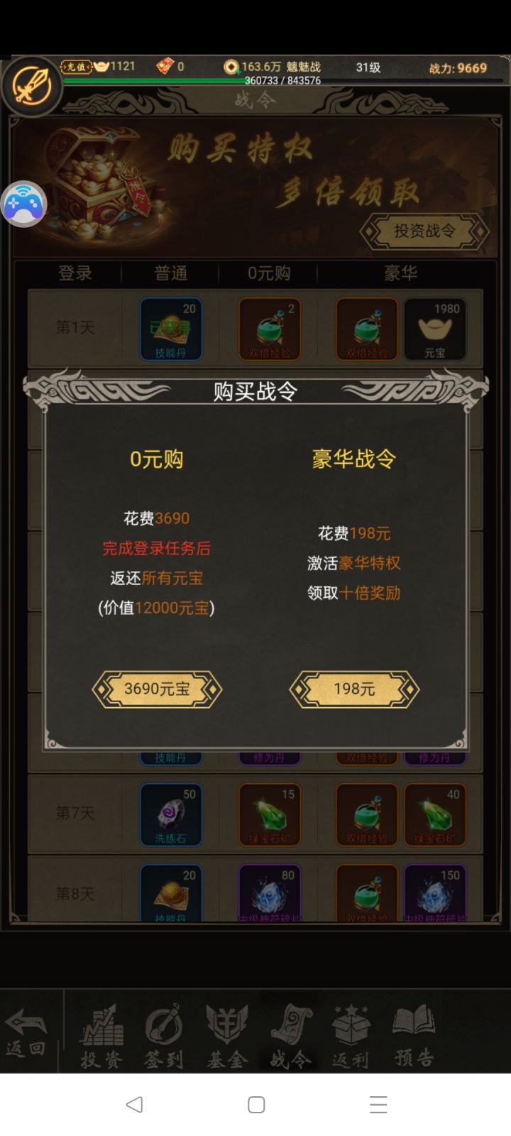 一款玩法多样的传奇类游戏,白嫖也能玩的。开号给的福利很多,签到还给代金券。首冲选了两档,再加上7天签到,就够买挂机权限了,美滋滋。