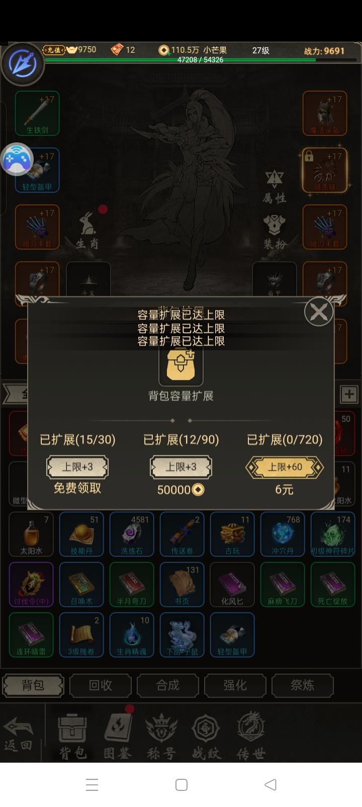 背包扩容不能扩,提示已满上限。