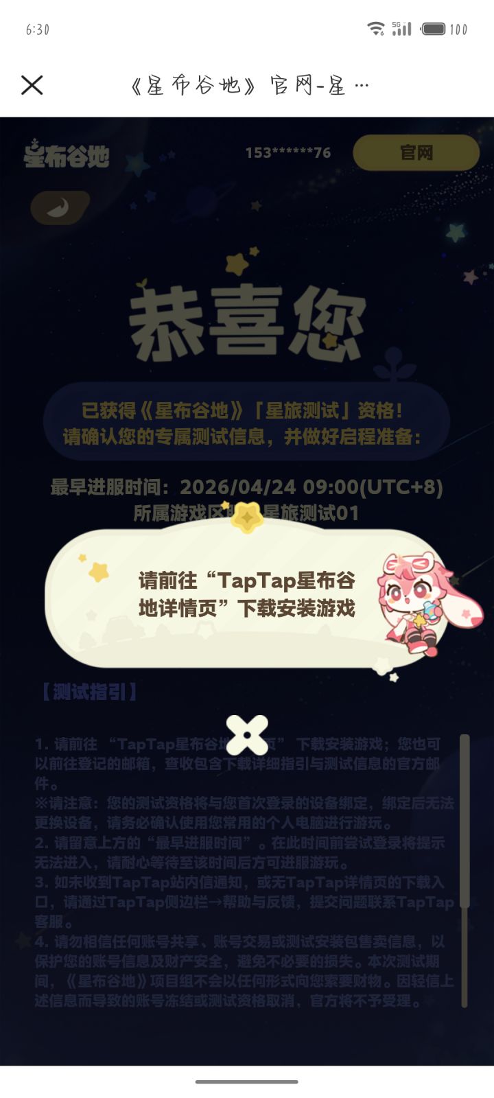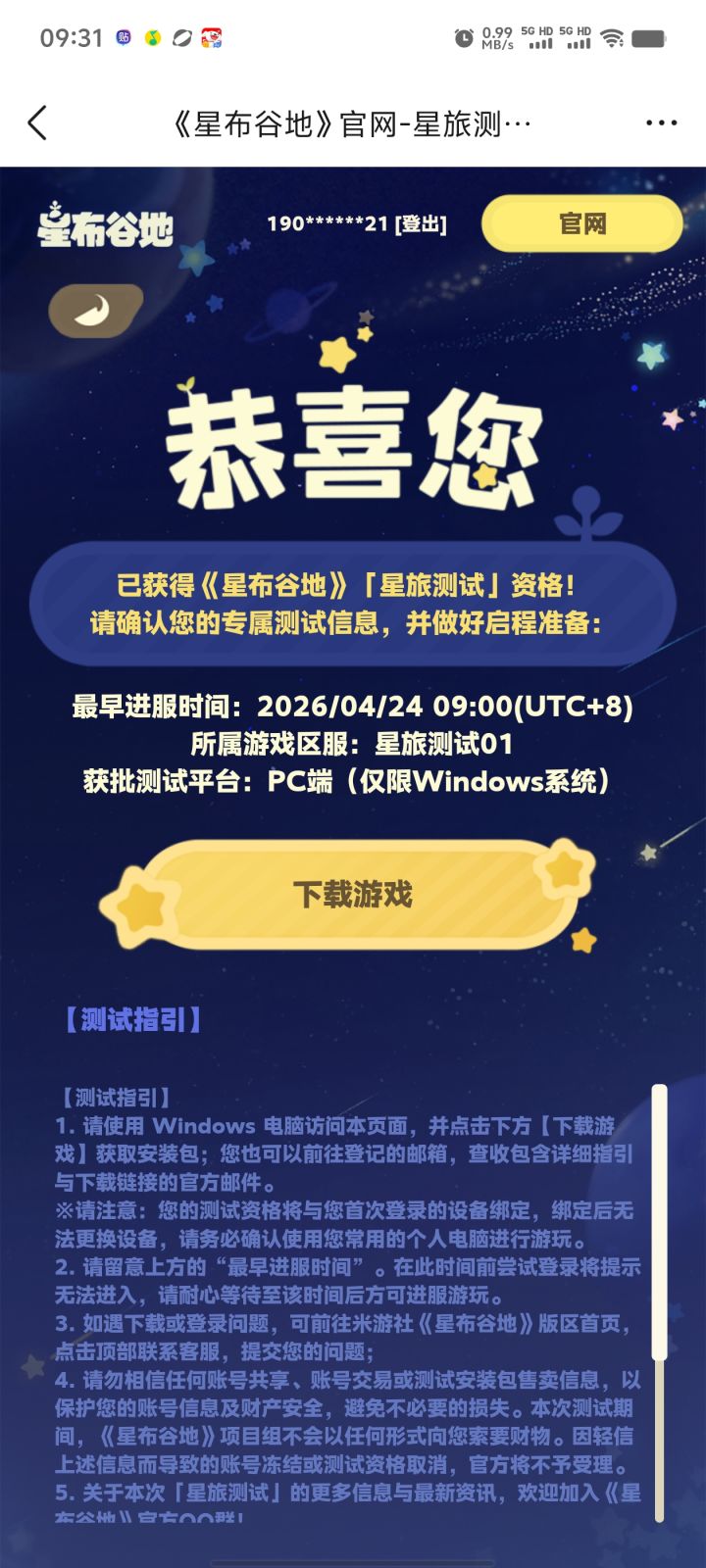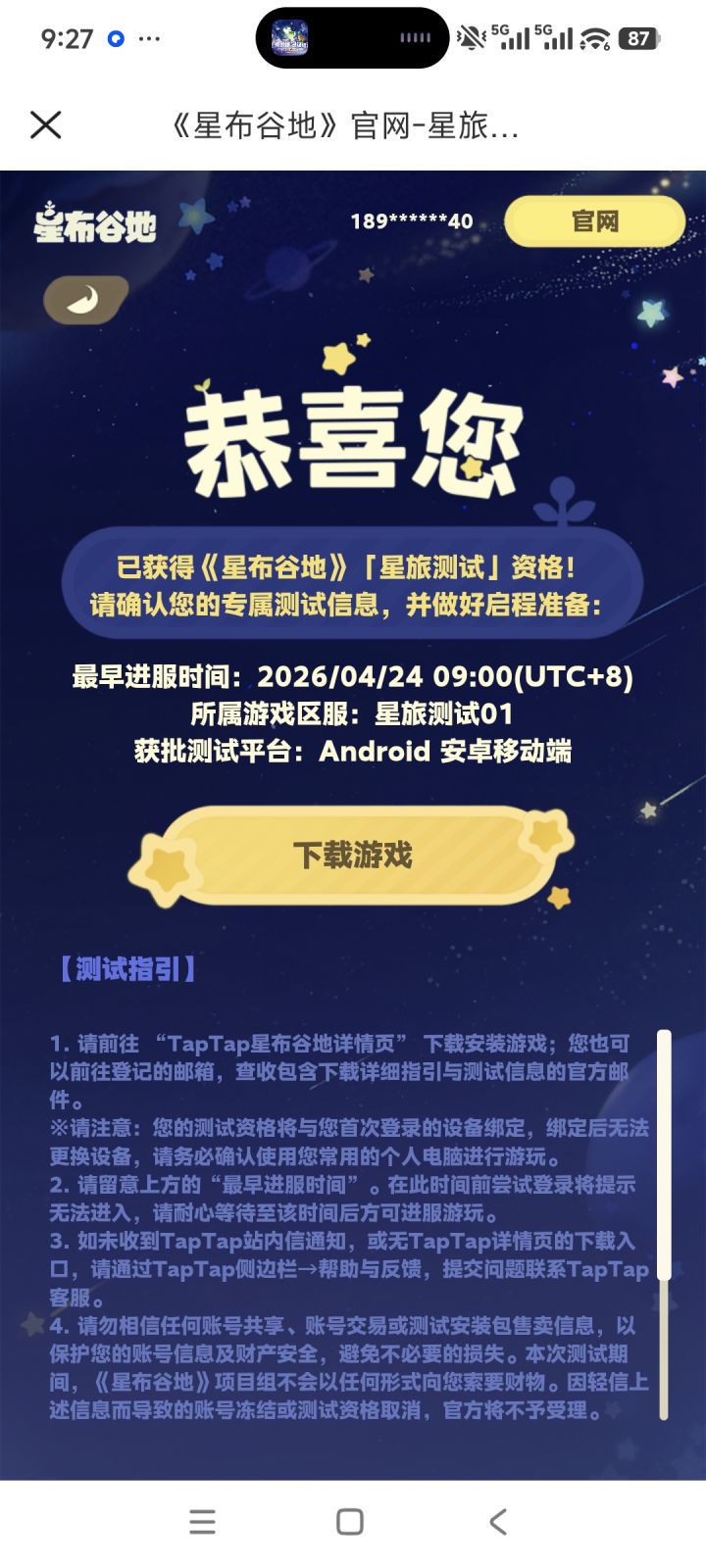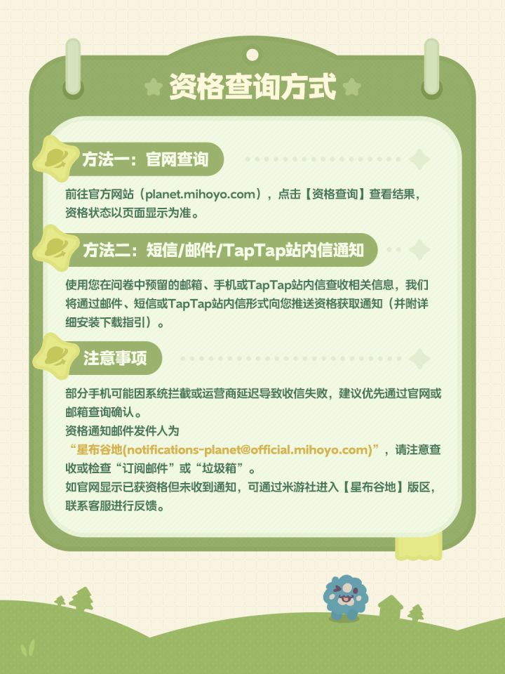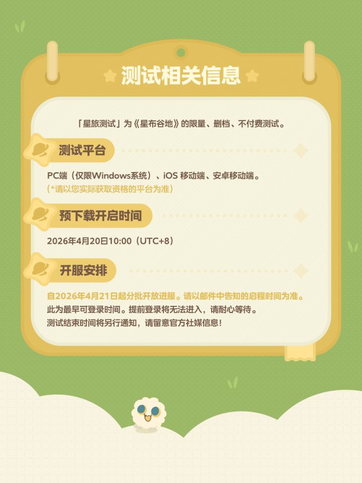 春天是适合播种的季节。而那些种下期待的人,或许,也会收到来自星海的回音…… ⭐《星布谷地》「星旅测试」测试资格将于 2026年4月20日10:00(UTC+8)起陆续发放,游戏预下载现已开启。种星人可通过以下方式查询资格获取信息。具体进服时间与平台设备信息,均以官方资格查询界面为准。 ⭐写给暂未获得资格的种星人🌱※本次仅为“首批”资格发放,后续仍有惊喜掉落的机会哦!请大家持续关注官方动