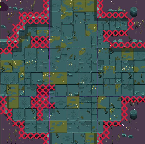 对于初期的时候,我们的设想是通过PCG加上有限素材去生成随机无限的大地图, 经过不停的生成算法探索, 加上自定义地块拼接规则的尝试, 最终实现的如封面所示的毫无美感的地图(这一步对于21天挑战来说损耗很大, 特别耽误时间::>_<::)不断探寻方案后, 发现还是自己制作小块地图+加上随机拼接才能达到可控的效果(图二为自定义区域A), 后续随着版本迭代可以加上更多有趣味性的区域, 下一步就是在此基